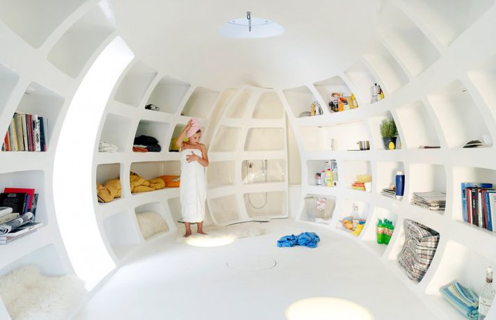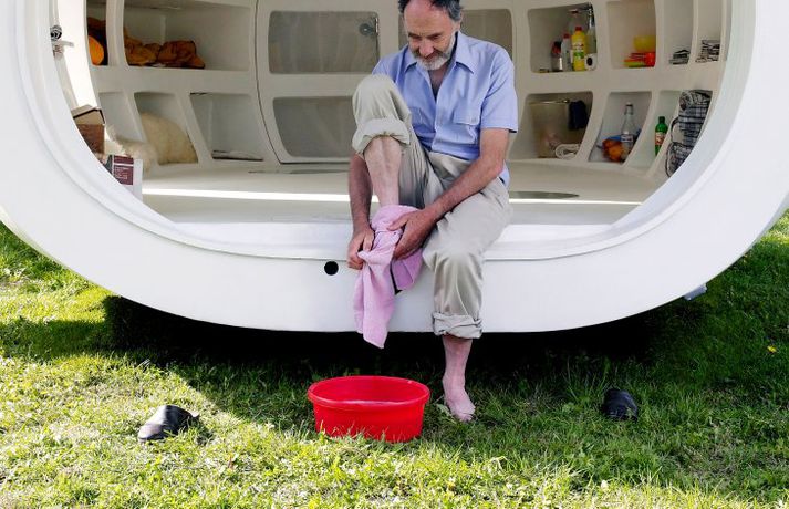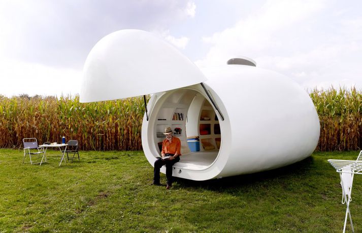 Veggirnir í egglaga húsi, sem skoða má í meðfylgjandi myndasafni, eftir dmvA arkítekta, eru afskaplega vel nýttir. Sofa má í hliðum hússins, elda, vaska upp sem og geyma ýmsa hluti. Þá er einnig klósett og sturta í öðrum enda hússins. Húsið, sem er á stærð við hjólhýsi, má nota sem gestaherbergi, vinnustofu eða móttöku. Það er færanlegt hvert sem er.