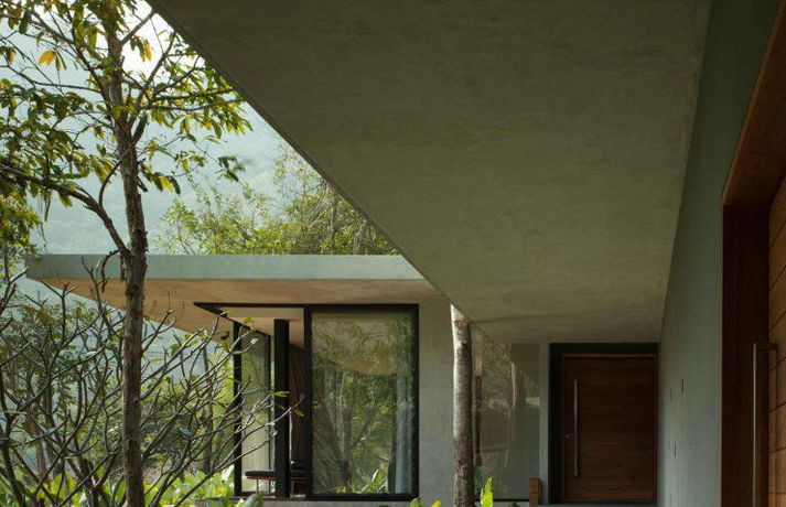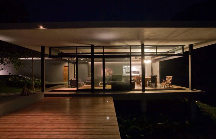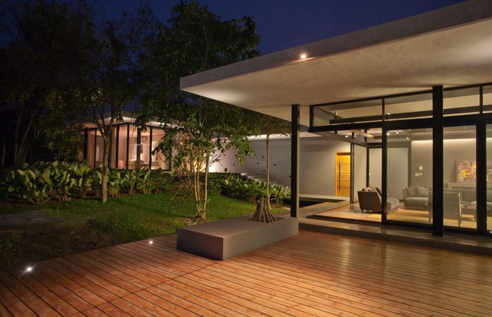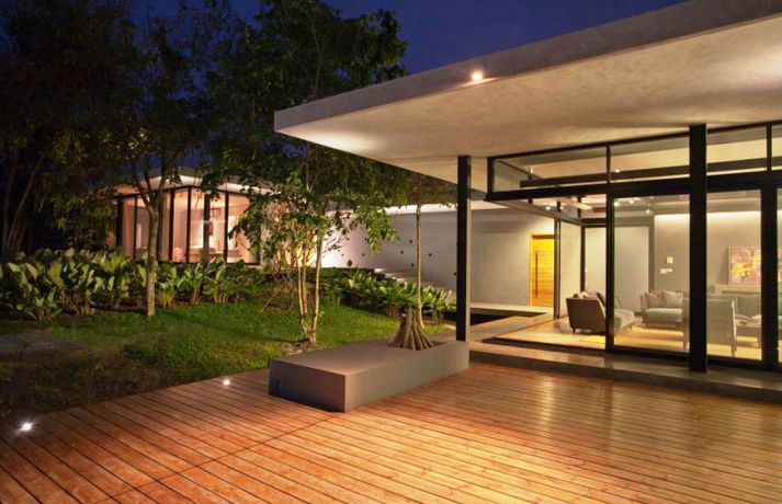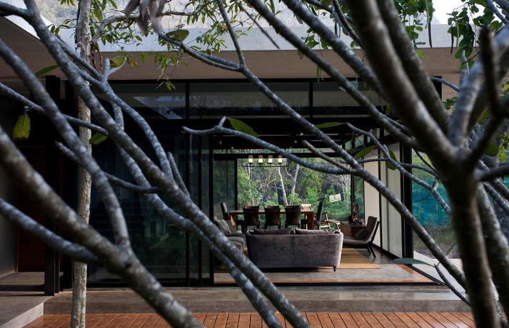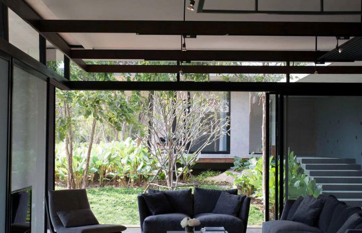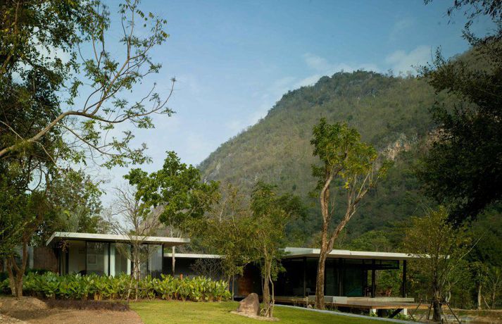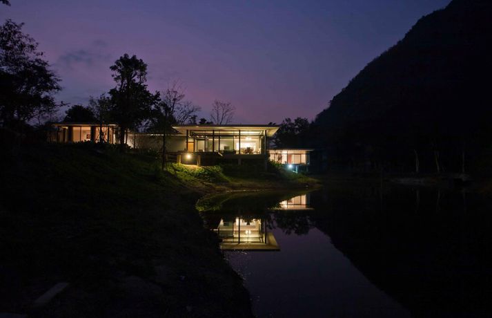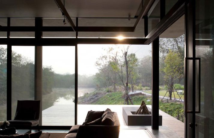 Meðfylgjandi má sjá myndir af glæsivillu í Kaoyai, sem er þjóðgarður í Tælandi. Vatnið, grasið og trén skapa rómantíska stemningu í gluggastóru rúmgóðu húsinu sem er byggt á nokkrum pöllum. Þá eru stórir gluggar í þaki hússins sem sjá til þess að birtan flæði fallega í rýminu.