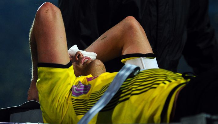 Lít út fyrir að hafa lent í bardaga á móti báðum Klitschko-bræðrunum í einu Óskar Ófeigur Jónsson skrifar 7. desember 2011 23:45 Sebastian Kehl. Mynd/Nordic Photos/Bongarts Sebastian Kehl, fyrirliði Dortmund, fékk slæmt spark í andlitið í Meistaradeildarleiknum á móti Marseille í gærkvöldi og var borinn útaf eftir aðeins rúmlega hálftíma leik. Stephane Mbia, leikmaður Marseille, fékk gula spjaldið fyrir sparkið en Kehl endaði upp á spítala. „Fyrst koma góðu fréttirnar. Það er ekkert brotið og augað er í lagi," sagði Sebastian Kehl á fésabókarsíðunni sinni. „Nú koma hinsvegar slæmu fréttirnar. Ég lít út fyrir að hafa lent í bardaga á móti báðum Klitschko-bræðrunum í einu," skrifar Sebastian Kehl. Leikmenn Dortmund hafa verið afar óheppnir í vetur þegar kemur að andlitsmeiðslum því þetta eru þriðju slík meiðsli á stuttum tíma. Miðjumaðurinn Sven Bender kjálkabrotnaði á tveimur stöðum í leik á móti Arsenal fyrir tveimur vikum og varnarmaðurinn Neven Subotic kinnbeinsbrotnaði í byrjun nóvember. Sebastian Kehl er 31 árs varnartengiliður og hefur spilað með Dortmund frá árinu 2001. Hann lyfti Þýskalandsskildinum eftir sigur liðsins í þýsku deildinni síðasta vor. Meistaradeild Evrópu Mest lesið Arnar Daði rekinn frá Stjörnunni en áfram þjálfari kvennaliðsins Handbolti Koepka fyrsta stjarnan sem riftir samningi við LIV Golf Ótrúlegur sigur á HM: „Ég er mjög tregur svo pressan nær ekki til mín“ Sport „Þetta er stærsti klúbbur Íslands“ Íslenski boltinn Man. Utd reyndi stíft en Semenyo kaus City Enski boltinn Sagan ekki sönn: „Veit ekki hvaðan þetta á að hafa komið“ Íslenski boltinn Öll höllin æpti nafn Gísla í spennutrylli Handbolti Þessi tíu eru tilnefnd sem Íþróttamaður ársins 2025: 23 ára aldursmunur Sport Arsenal í undanúrslit eftir vító Enski boltinn Stefndi á ÓL en fannst látinn á hótelherbergi Sport Fleiri fréttir „Þetta er stærsti klúbbur Íslands“ Kaupmannahafnarbúi afgreiddi Úganda Arsenal í undanúrslit eftir vító Man. Utd reyndi stíft en Semenyo kaus City Iwobi og Lookman áberandi í sigri Nígeríu „Tölfræðilega séð eiga þeir ekkert að vera í þessari stöðu“ Amanda hætt hjá Twente Jackson hóf Afríkumótið með látum Fullkrug leysir Origi af í Mílanó Versta tímabil Vinícius í mörg ár og samningaviðræður sigla í strand Kongóliðar byrja á sigri Glódís framlengir samninginn við Bayern Chelsea setur sig í samband við Semenyo Sagan ekki sönn: „Veit ekki hvaðan þetta á að hafa komið“ Hætt við að spila í Ástralíu en óvíst hvar leikurinn verður Neymar kominn á lappir og lofar að skora í úrslitaleik HM Jiménez jafnaði bestu vítaskyttu sögunnar Slot mun sakna Isak í tvo mánuði eftir „glórulausa tæklingu“ Sjáðu „auma“ vítið sem skilaði Fulham sigri Erfitt að vera í burtu þegar mamma greindist „Svona lítur frábær ákvörðun út“ Einn leikmaður með samning og völlurinn ólöglegur Salah færði Egyptum draumabyrjun Fulham skildi Forest eftir við fallsvæðið Áfallið staðreynd og Isak búinn í aðgerð Neres hetja Napoli í Sádi-Arabíu Aron Einar lagði upp dýrmætt sigurmark Afkáralegt fagn hjá hetju Sambíu Glódís Perla veik í jólafríið en enn taplaus Glódís og Hákon best í fótboltanum á árinu Sjá meira