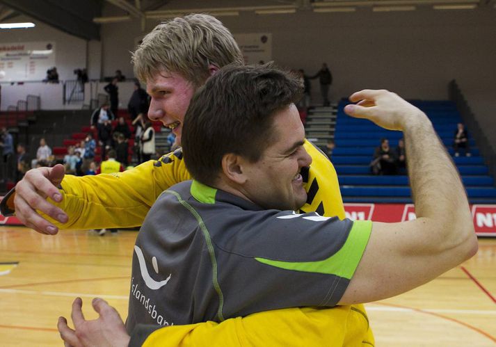 Umfjöllun og viðtöl: Haukar - FH 22-14 | Haukar í bikarúrslitin Kolbeinn Tumi Daðason í Schenker-höllinni skrifar 12. febrúar 2012 14:30 Haukar eru komnir í úrslit Eimskipsbikarsins í handknattleik eftir sigur á erkifjendunum í FH. Lokatölurnar urðu 22-14 eftir að staðan í hálfleik var 10-10. Vörn og markvarsla Arons Rafns Eðvarssonar í síðari hálfleik lögðu grunninn að sigri Hauka. FH-ingar skoruðu aðeins fjögur mörk í síðari hálfleiknum. Það var ljóst frá fyrstu mínútu að það var meira undir í þessum leik en í viðureign liðanna í deildinni fyrr í vikunni. Báðar varnir gengu vasklega fram sem gerði nokkuð taugatrekkum sóknarmönnum beggja liða erfitt fyrir. Þá vantaði ekki lætin í stúkunni og lét stuðningsmenn á báðum hliðum vel í sér heyra. Fyrri hálfleikurinn var nokkuð jafn en um hann miðjan náðu Haukarnir tveggja marka forystu sem þeim hélst nokkuð þægilega á. Mest var forystan þrjú mörk en FH-ingarnir sýndu styrk undir lok hálfleiksins og jöfnuðu loks 10-10. Sú var staðan er gengið var til búningsherbergja. Umdeilt atvik átti sér stað seint í fyrri hálfleik. Þá varði Daníel Freyr víti frá Stefáni Rafni með höfðinu. Boltinn sneiddi höfuð Daníels og skoppaði af því yfir markið. FH-ingar vildu að Stefán fengi rautt spjald fyrir að skjóta í höfuð markvarðar úr vítakasti en dómararnir voru ekki sammála. Óhætt er að segja að leikurinn hafi tekið óvænta stefnu í síðari hálfleik. Aron Rafn kom í mark Haukanna og við tók löng bið FH-inga eftir marki. Fyrsta mark þeirra í hálfleiknum kom eftir 13 mínútna leik og það næsta eftir 23 mínútna leik þegar þeir minnkuðu muninn í 18-12. Þegar upp var staðið í síðari hálfleiknum hafði FH aðeins skorað fjögur mörk sem dugar ekki til að vinna handboltaleik. Haukar lönduðu öruggum sigri 22-14 og eru komnir í bikarúrslit. Það kemur í ljós annað kvöld hvort andstæðingar Hauka í úrslitum verða HK eða Fram. Aron Rafn: Aldrei verið jafnspenntur fyrir leik FH„Á mínum yngri árum var ég pirraður að byrja ekki leikina. Ég held að það hafi bara þroskast af mér. Nú reyni ég að vera á tánum. Þegar þú kemur inn af bekknum þarftu að standa þig því oftast hefur hinn markvörðurinn ekki verið að standa sig," sagði Aron Rafn og hrósaði Birki fyrir hans frammistöðu fram að brottvísuninni. „Birkir er klassa markvörður og var góður í dag eins og á fimmtudaginn. Hann hegðaði sér reyndar ekki eins og reynslumesti maður vallarins þegar hann sagði dómurunum til syndanna undir lok fyrri hálfleiksins," sagði Aron Rafn í gamansömum tón en brottvísun Birkis Ívars varð til þess að Aron kom inn á. FH skoraði aðeins fjögur mörk í öllum seinni hálfleiknum. Ótrúlega lágt markaskor í nútíma handbolta. „Vörnin var fáránlega góð. Freysi, Matti, Svenni, Stebbi og Gylfi, það voru bara allir fáránlega góðir og staðráðnir að vinna þennan leik. Við gáfum okkur alla í leikinn vitandi það að þetta væri úrslitaleikur. Það verður gaman að spila í Laugardalshöllinni," sagði Aron sem var ánægður með að kvitta fyrir tapið gegn FH í deildinni á fimmtudag. „Ég svaf bara í þrjá tíma nóttina eftir tapið á fimmtudaginn, ég var svo svekktur. Ég held ég hafi aldrei verið jafnspenntur fyrir leik gegn FH að geta svarað fyrir þann leik," sagði maður leiksins. Andri Berg: Aron ver hreinlega alltÞjálfarar og leikmenn FH voru fljótir að koma sér inn í klefa í leikslok. Andri Berg Haraldsson gaf sér þó tíma til að ræða við blaðamann. Liðin mættust í deildinni á fimmtudag og var staðan í hálfleik þá 10-10 líkt og nú. Þá tóku FH-ingar völdin í síðari hálfleik en áttu ekkert svar í dag. „Þetta snerist við. Við áttum seinni hálfleikinn síðast en þeir núna. Aron ver hreinlega allt í markinu, reyndar ekki góð skot hjá okkur en þeir ganga bara á lagið," sagði Andri Berg. Leikmenn FH gerðu sig seka um ótal mistök í sóknarleiknum. Þeir töpuðu boltanum á klaufalegan hátt og náðu ekki að skapa sér góð færi. Andri var ekki viss um að hjartslátturinn hefði verið örari í þessum leik vegna þess hvað var í húfi. „Þessir Hafnarfjarðarleikir eru auðvitað svakalegir en við ætluðum bara að vinna þennan leik eins og þann seinasta. Það var kannski meira í húfi en þeir voru bara betri," sagði Andri Berg. „Þetta var stirrt hjá okkur í sókninni og þeir ganga á lagið í vörninni. Svo ver hann auðvitað allt í markinu," sagði Andri sem var beðinn um að finna eitthvað jákvætt við frammistöðu FH-inga. „Markvarslan er alltaf góð hjá okkur og vörnin þokkaleg. En þegar sóknarleikurinn er svona þarf vörnin að vera ennþá betri," sagði Andri sem segir leiðinlegt að komast ekki í bikarúrslit en enn verra að Haukar fari þangað í þeirra stað. „Já, það er ömurlegt. Það verður bara að halda með hinu liðinu sem verður vonandi Fram." Aron Kristjáns: Erfitt að ákveða hver byrjar í markinu„Ég vil fyrst og fremst hrósa liðinu fyrir frábæra baráttu. Við hirðum alla lausa bolta, vörnin er mjög þétt og markverðirnir vörðu mun betur en á fimmtudaginn," sagði kampakátur Aron Kristjánsson, þjálfari Hauka, í leikslok. „Því má ekki gleyma að Daníel varði vel í FH-markinu. Við töluðum samt mikið um að þora að taka færin okkar, halda áfram öguðum leik og ekki láta það á okkur fá þó hann væri að verja. Það var auðvitað mjög ánægjulegt," sem gat þó ekki annað en hrósað Aroni Rafni sérstaklega. Aron Rafn stóð vaktina í marki Hauka í síðari hálfleik og því sem næst lokaði því. Aron þjálfari sagði að sér hefði verið vandi á höndum fyrir leikinn að ákveða hvor markvörðurinn myndi byrja. „Okkur var