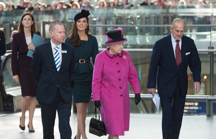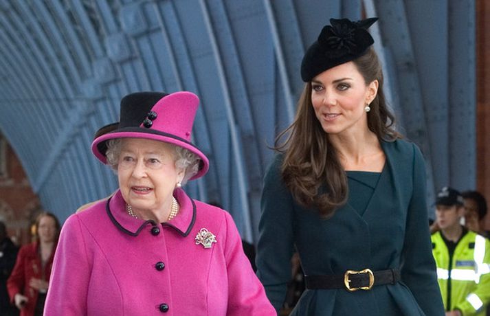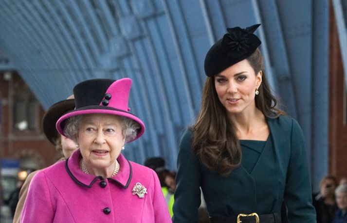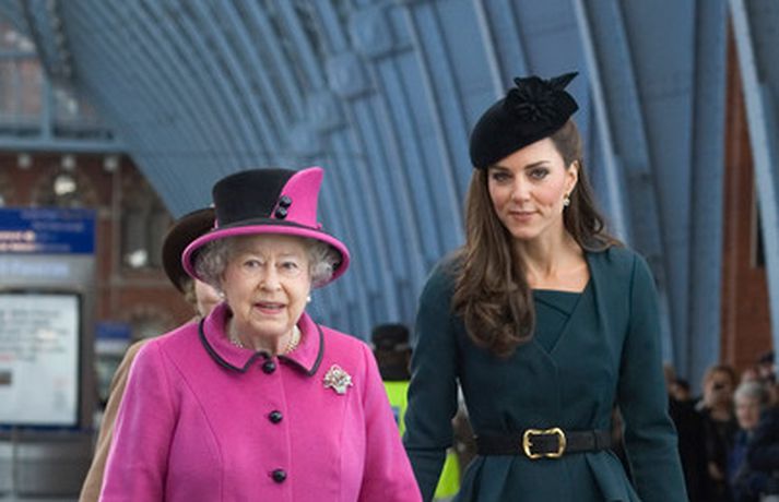 Kate Middleton, hertogaynjan af Cambridge og Elizabeth Bretadrottning mættu uppábúnar á St Pancras stöðina í dag í Lundúnum þar sem þær heilsuðu upp á almenning. Eins og sjá má var Kate óaðfinnanlega klædd eins og ávallt. Hún var í grænblárri dragt, með hatt á höfði og belti í mittið. Skoða má Kate í myndasafni.