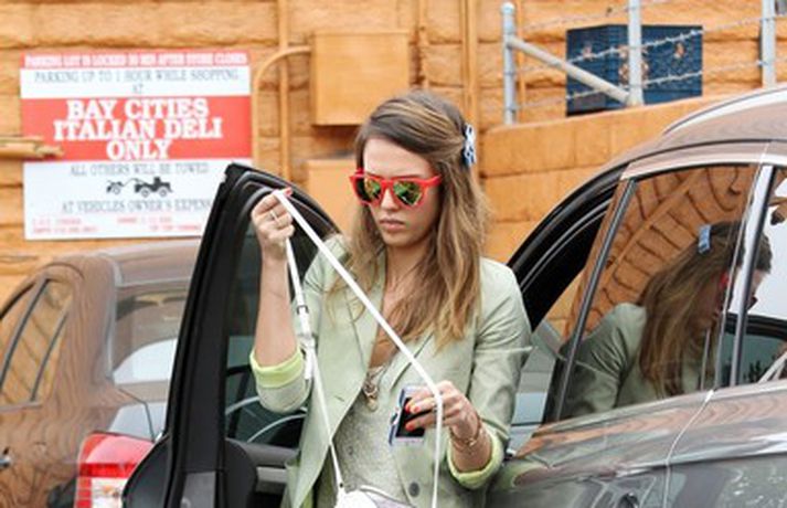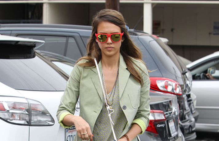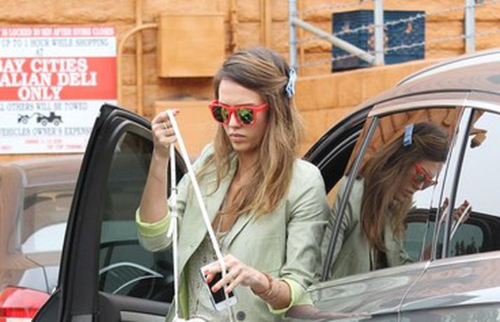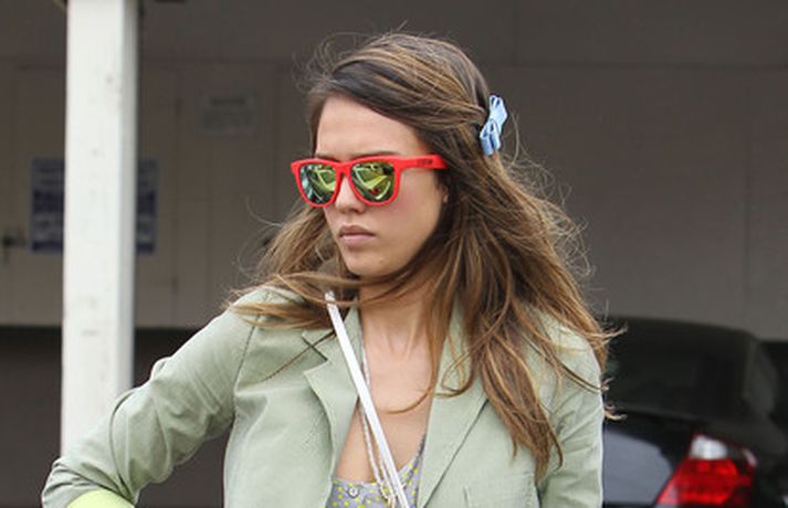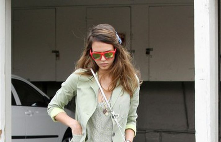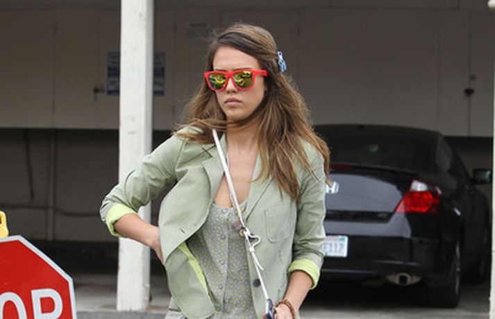 Leikkonan Jessica Alba, 31 árs, var klædd í neonlitaða sandala þegar hún var mynduð á ferðinni í Santa Monica í fyrradag. Hún hefur í nægu að snúast því samhliða leiklistinni hefur hún stofnað barnafatalínu en hún er tveggja barna móðir. Eins og sjá má í myndasafni voru sandalarnir með fylltum hæl en þeir fóru leikkonunni sem var klædd í gallabuxur afskaplega vel.myndir/cover media