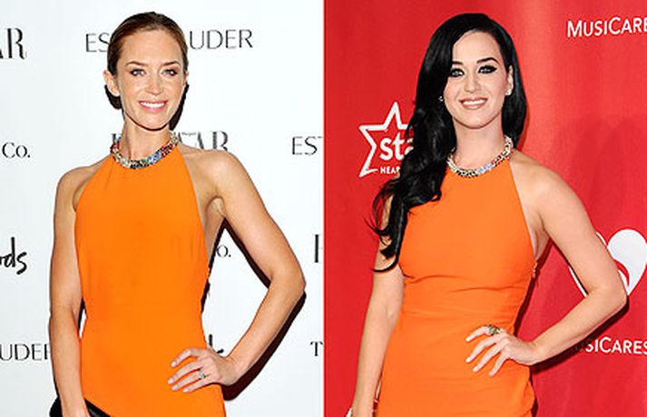 Við sáum Emily Blunt klæðast dásamlegum appelsínugulum kjól frá Alexander McQueen á rauða dreglinum fyrir verðlaunaafhendingu í október í fyrra. Við kjólinn var hún með uppsett hár, fallega hringi og svarta McQueen handtösku.Í síðustu viku klæddist Kathy Perry svo nákvæmlega sama kjól úr smiðju McQueen á tónlistarviðburði. Hún var með dömulega liði í háriu og stakan kokteilhring við.Þá er bara spurningin hvor þeirra klæddist kjólnum betur?