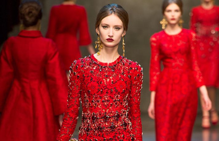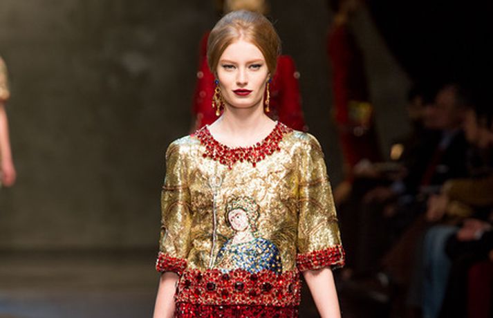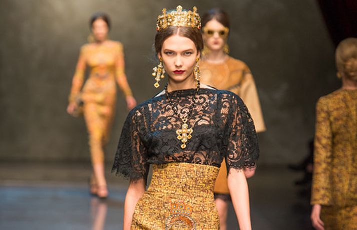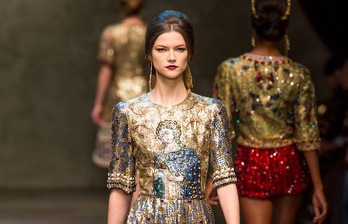 Það bíða alltaf margir spenntir þegar Dolce and Gabbana tískuhúsið sviptir hulunni af nýrri línu. Þær eru alltaf heljarinnar veisla fyrir augað og það virðist ekki vera til neitt sem heitir ,,of mikið" í hugum Stefano Dolce og Domenico Gabbana. Í ár varð engin undantekning þar á, en hönnunartvíeykið sótti innblásturinn að þessu sinni til kaþólsku kirkjunnar. Stórar myndir af dýrlingum prýddu kjólana, mynstur minntu á mósaík úr kirkjulist og fyrirsæturnar gengu sýningarpallana með krosslaga eyrnalokka og kórónur.