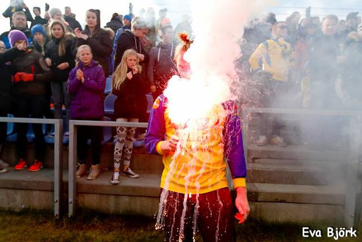 Barn brenndist er stuðningsmaður Fjölnis fagnaði með blysi Stefán Árni Pálsson skrifar 21. september 2013 17:54 Hér má sjá stuðningsmann Fjölnis með blys. Ekki er vitað hvort hann tengist atvikinu sem um ræðir. myndir /EVa Björk Ægisdóttir Fjölnir komst upp í Pepsi-deild karla í dag eftir sigur á Leikni 3-1 upp í Breiðholtinu og mikil fagnaðarlæti brutust út eftir leikinn. Samkvæmt heimildum Vísis mun einn stuðningsmaður Fjölnis hafa verið með blys í fagnaðarlátunum og á lítil stúlka að hafa brennst lítillega á hönd. Stuðningsmaður Fjölnis mun hafa sveiflað blysinu með fyrrgreindum afleiðingum. „Við vorum að spila á útivelli og getum því ekki borið ábyrgð á gæslunni á Leiknisvelli,“ segir Kristján Einarsson, formaður knattspyrnudeildar, Fjölnis. „Sjálfur var ég að frétta af þessu og okkur þykir þetta alveg gríðarlega leiðinlegt. Þetta var víst einn stuðningsmaður okkar sem var blysið og stelpan á að hafa staðið fyrir aftan hann. Svona atvik eru leiðinlegt og vonandi fór þetta ekki illa.“ „Það er mjög erfitt að ætla halda einhverri gæslu uppi þegar menn vinna svona mikilvæga sigra. Gæslumenn Leiknis reyndu að stöðva mannskapinn að fara inn á völlinn en eðlilega gekk það ekki.“ Þess má geta að stuðningsmenn KV fögnuðu einnig með blysum í leikslok þegar liðið hafði tryggt sér sæti í 1. deild karla eftir jafntefli gegn Gróttu. Íslenski boltinn Mest lesið Þessi tíu eru tilnefnd sem Íþróttamaður ársins 2025: 23 ára aldursmunur Sport Sagan ekki sönn: „Veit ekki hvaðan þetta á að hafa komið“ Íslenski boltinn Sakaður um niðurlægingu: „Við viljum ekki hafa hann sem þjálfara“ Handbolti Erfitt að vera í burtu þegar mamma greindist Fótbolti Glódís framlengir samninginn við Bayern Fótbolti Slot mun sakna Isak í tvo mánuði eftir „glórulausa tæklingu“ Enski boltinn Kansas frá Kansas til Kansas Sport Einn leikmaður með samning og völlurinn ólöglegur Fótbolti Áfallið staðreynd og Isak búinn í aðgerð Enski boltinn Tryggðu þrjú lið í úrslitakeppnina Sport Fleiri fréttir Sagan ekki sönn: „Veit ekki hvaðan þetta á að hafa komið“ Meira en 37 stöðugildi hjá Knattspyrnusambandi Íslands Óskar Hrafn um komu Arnórs Ingva: „Gífurlega dýrmætt fyrir KR“ Arnór Ingvi orðinn leikmaður KR Breiðablik kaupir Jónatan frá Norrköping Elías mættur til meistaranna KR sagt vera að landa Arnóri Ingva Hilmar Árni til starfa hjá KR Segir fjórðung í bók Óla ósannan Víkingur í úrslit Bose-bikarsins eftir sigur „Verið heiður að spila í appelsínugulu með frábærum liðsfélögum“ Þekkir Egilshöllina vel og skoraði gegn fyrrum félögum Strákar Heimis Guðjóns fengu slæman skell í fyrsta leik Axel verður áfram hjá Aftureldingu Kveður pabba sinn í Laugardalnum og fer til FH „Félag sem var í basli með að ná endum saman og greiða laun á réttum tíma“ Skrýtið og taktlaust: „Ég er ekkert sátt með niðurstöðuna“ Fanndís kveður sviðið: „Ég er búin að fella nokkur tár“ Gylfi með tvö og Víkingar byrja á sigri Frá Akureyri til Danmerkur Markadrottningin heldur að landsliðið sé búið spil Strákarnir í 2. flokki Vals þeir einu sem ekki spila fyrir áramót Dæturnar vildu norður: „Mun alltaf gera allt fyrir þær“ Stjarnan sækir markvörð í 3. deildina „Ég var orðinn algjörlega bugaður“ Jónatan áfram á Hlíðarenda: „Var alltaf jákvæður fyrir því að framlengja“ Óli Jó kallar ráðninguna á Jóa Kalla algjört bull „Ég elska þig Ísland, takk fyrir allt!“ Sextán ára með fernu fyrir meistara Víkings Valur dregur sig úr Bose-bikarnum Sjá meira
