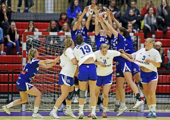 „Þetta var risastór dagur fyrir mig. Mér leið vel í upphafi leiks enda hafði ég fundið fyrir miklu trausti frá þjálfurunum. Það var samt svolítið stress en það fór fljótt af mér,“ sagði Unnur Ómarsdóttir eftir leik en hún var að spila sinn fyrsta alvörulandsleik. Unnur fór beint í byrjunarliðið og stóð sig gríðarlega vel. Skoraði úr öllum sínum skotum og hefði líklega ekki getað fengið betri byrjun á landsliðsferlinum. Kom því ekki á óvart að hún brosti allan hringinn eftir leik. „Ég var rosalega fegin að öll skotin skyldu fara inn,“ sagði Unnur og hló. Finnska liðið er nú ekki það sterkasta í Evrópu og hafði tapað öllum níu leikjum sínum í undankeppni EM. Þar af hafði liðið tapað í tvígang fyrir Bretum í síðustu keppni en Bretar hafa ekki beint verið að skapa usla í evrópskum handknattleik til þessa. Það voru því allar líkur á því að íslenska liðið ætti náðugt kvöld í vændum. Það gekk eftir. Íslenska liðið tók verkefnið alvarlega strax frá upphafi og hið arfaslaka lið Finnlands átti ekki roð í það. Finnsku stelpurnar varla drifu á markið lengi vel. Leikstjórnandinn skrefaði í annað hvert skipti sem hún fékk boltann. Þær áttu eina ágæta skyttu, Cainberg, sem hélt liðinu á floti framan af. Svo var hún sett í hornið og á línuna. Afar furðulegt enda eina raunverulega ógnin frá henni. Sonja Koskinen var öflug í finnska markinu og bjargaði því sem bjargað varð. Varði fjölda skota úr dauðafærum. Engu að síður var tíu marka munur í leikhléi, 18-8. Jenný varði vel í íslenska markinu líka en þurfti ekki að glíma við erfiðustu skot sem hún hefur séð á ferlinum. Engu að síður einbeiting í lagi. Vörnin stóð vel lengstum og sóknarleikurinn flaut oft vel. Sérstaklega gekk línuspilið vel en nýtingin hjá íslenska liðinu hefði mátt vera betri. Þær klúðruðu allt of mörgum dauðafærum. Síðari hálfleikur var í raun formsatriði. Stelpurnar reyndu þó að keyra af krafti en nokkur klaufagangur var oft á sóknarleiknum. Sextán marka sigurinn var síst of stór. „Það var gott að ná að rúlla öllum mannskapnum og svo náðum við líka að vinna í 5-1 varnarleiknum okkar. Það gekk vel. Við fórum kannski illa með mörg færi en heilt yfir var þetta fagmennska hjá stelpunum að halda út allan leikinn,“ sagði Ágúst Þór Jóhannsson landsliðsþjálfari eftir leik.