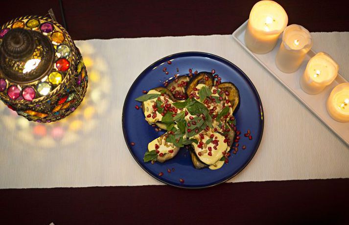 Hátíðlegar arabískar kræsingar Sólveig Gísladóttir skrifar 11. desember 2013 15:30 Hátíðarborðið er afar jólalegt þótt það sé skreytt í arabískum anda. Flesta munina fékk Sigurþór lánaða í The Pier til að auka á hina arabísku stemningu. Mynd/Daníel Sigurþór Gunnlaugsson á fleiri matreiðslubækur en hann hefur tölu á og les þær eins og góðar bókmenntir. Hann ferðast oft til Sádi-Arabíu vegna vinnu sinnar og hefur lært að meta matarmenningu landsins. Hann gefur hér uppskriftir að arabískri veislu.Arabískur matur er hættulega bragðgóður og seiðandi eins og ævintýrin í 1001 nótt,“ segir Sigurþór. Hann bætir við að í hvert sinn sem arabar setjist niður til að matast megi búst við veislu enda iðulega margréttað í boði. Veisluréttina sem Sigurþór gefur uppskrift að eldaði hann upp úr bókunum „Ottolenghi: The Cookbook“ og „Jerusalem“. „Þær eru skrifaðar af mönnum sem eru fæddir árið 1968 með aðeins nokkurra vikna millibili, hvor sínum megin við Jerúsalem. Yotam Ottolenghi er fæddur í Ísrael og Sami Tamimi fæddist í Palestínu. Um tíma bjuggu þeir báðir í sama hverfinu í Tel Avív en það var ekki fyrr en þeir fluttust til London og fóru að vinna í sama bakaríinu við að hnoða brauð að þeir kynntust og opnuðu síðar einn af vinsælustu matsölustöðum Lundúna sem heitir Ottolenghi og er í Islington,“ lýsir Sigurþór og hvetur alla sem eiga þar leið um til að smakka matinn þeirra.Spínatsalat með döðlum og hnetumFyrir 4 1 msk. hvítvínsedik ½ rauðlaukur, skorinn þunnt 100 g steinlausar döðlur skornar í fernt 30 g ósaltað smjör 2 msk. ólífuolía 2 pítubrauð, rifin 75 g möndlur með hýði, saxaðar gróft 1 tsk. sítrónubörkur ½ tsk. salt ½ tsk. rauðar chili-flögur 150 g spínat 2 msk. sítrónusafi saltSetjið edik, lauk, döðlur ásamt skvettu af salti í skál og blandið vel með höndunum. Látið standa í um 20 mín. og hellið edikinu svo af. Á meðan er smjörið hitað og helmingurinn af ólífuolíunni, 1 msk. Setjið pítubrauðin ásamt möndlunum út í og eldið á meðalhita í um 4-6 mín. Hrærið allan tímann þangað til pítubrauðið er orðið stökkt og gullinbrúnt. Takið af hitanum og blandið sítrónuberkinum, chili-flögunum og ½ tsk. salti saman við. Látið kólna. Rétt áður en salatið er borið fram er spínatinu blandað saman við pítu-blönduna í stórri skál. Bætið við döðlunum, rauðlauknum, sítrónusafanum, afganginum af ólífuolíunni, 1 msk., og dálitlu salti.Grillað eggaldin með saffran-jógúrtsósuFyrir 4Saffran-jógúrtsósa örfáir saffranþræðir 3 msk. heitt vatn 180 g grísk jógúrt 1 hvítlauksrif, marið 2½ msk. sítrónusafi 3 msk. ólífuolíaLátið saffranþræði liggja í heitu vatni í lítilli skál í um 5 mín. Hellið út í skál sem inniheldur jógúrt, marið hvítlauksrif, sítrónusafa, ólífuolíu og örlítið salt. Hrærið þar til úr verður sósa með ljósgylltri áferð. Smakkið til og bætið út í salti ef þess gerist þörf. Kælið. Geymist í allt að þrjá daga í kæli.Grillað eggaldin og fleira 3 meðalstór eggaldin, skorin niður í 20 cm þykkar sneiðar eða báta 2 msk. ristaðar furuhnetur lófafylli af granateplafræjum 20 basilíkulauf ólífuolía, til að pensla gróft sjávarsalt og svartur piparHitið ofn á 220 gráðu hita. Raðið niðurskornu eggaldinsneiðum/bátum á ofnplötu. Penslið með olíu og saltið og piprið. Grillið í 25-30 mín., eða þar til sneiðar/bátar verða ljósbrúnar/ir að lit. Kælið. Eggaldinið geymist í allt að þrjá daga í kæli; látið standa við stofuhita áður en borið er fram. Stillið eggaldinsneiðum/bátum upp á stóran kringlóttan disk, þannig að sneiðar/bátar leggist ofan á hver aðra/hver annan. Hellið sósu rólega yfir, stráið furuhnetum og granateplafræjum ofan á og skreytið með basilíkulaufum í lokin.Marineraður lambahryggur með kóríander og hunangiFyrir 4 1 kg lambahryggur, skorinn í a.m.k. 2 cm kótilettur 20 g flatblaða steinselja, blöð og stilkar 30 g mynta, blöð og stilkar 30 g kóríander, blöð og stilkar 4 hvítlauksgeirar afhýddir 15 g ferskt engifer, afhýtt og skorið 3 rauðir chili, fræin fjarlægð ½ tsk. salt 50 ml sítrónusafi 60 ml sojasósa 120 ml ólífuolía 3 msk. hunang 2 msk. rauðvínsedik 4 msk. vatnSetjið kjötið í plast eða leirskál. Blandið öllu hinu innihaldinu saman í matvinnsluvél og hellið yfir kótiletturnar. Blandið vel saman, setjið sellófan yfir skálina og marinerið í ísskáp yfir nótt. Hitið ofninn í 200°C/180°C ef ofninn er með viftu. Setjið góða pönnu á hellu og hitið. Takið kjötið úr marineringunni og brúnið á pönnunni á öllum hliðum, u.þ.b. 5 mín. samtals. Setjið kjötið á ofnbakka og eldið í um 15 mín. fyrir létteldað eða lengur ef þess er óskað. Hellið marineringunni í pott og látið malla í um 5 mín. Setjið lambakótiletturnar á fat og berið fram ásamt marineringunni. Bæði kjötið og marineringuna er hægt að bera fram heitt eða við stofuhita.Arabískt eplasalatFyrir um 8 3 stk. hnúðkál sirka 750 g (eða um 5 epli) 80 g grísk jógúrt 70 g sýrður rjómi 50 g rjómi (36%) 1 stk. hvítlauksgeiri, saxaður fínt 1½ tsk. sítrónusafi 1 msk. ólífuolía 2 msk. fersk mynta, söxuð 1 tsk. þurrkuð mynta 20 g vatnakarsi/brunnperla (eða blanda af klettasalati og spínati) salt og hvítur piparAfhýðið hnúðkálið (eplin) og skerið í um 1,5 cm teninga og setjið í stóra skál. Ef notast á við epli, setjið þau í plastskál og kreistið sítrónu yfir svo þau verði síður brún. Setjið jógúrt, sýrðan rjóma, rjóma, hvítlauk, sítrónusafa og ólífuolíu ásamt ¼ tsk. af salti og vel af hvítum pipar í skál og hrærið vel saman. Hellið sósunni yfir hnúðkálið/eplin og bætið 