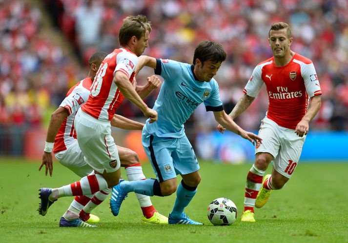 Spænski landsliðsmaðurinn David Silva mun spila með Manchester City til 33 ára aldurs en kappinn skrifaði undir nýjan fimm ára samning sem gildir til ársins 2019. Þetta kemur fram á heimasíðu ensku meistaranna. David Silva hefur verið í lykilhlutverki hjá City frá því að hann kom til liðsins sumarið 2010 og hefur unnið fimm titla með félaginu þar af varð hann Englandsmeistari í annað skiptið í vor. David Silva er nú 28 ára gamall en hann spilaði fjögur tímabil með Valencia áður en hann kom til Manchester. Hann var með 7 mörk og 9 stoðsendingar í 28 leikjum í ensku úrvalsdeildinni á síðustu leiktíð en var með 15 stoðsendingar þegar City vann titilinn fyrir tveimur árum. „Manchester City varð strax eins og mitt annað heimili þegar ég kom hingað fyrir fjórum árum. Ég er mjög sáttur hjá City, bæði fótboltalega og persónulega. Ég vil því halda áfram að vinna titla með þessu frábæra félagi," er haft eftir David Silva á heimasíðu Manchester City. David Silva hefur skorað 20 mörk í 83 landsleikjum með Spáni en hann varð í öllum þremur titlum Spánverja frá 2008 til 2012 (EM 2008, HM 2010 og EM 2012).Vísir/Getty