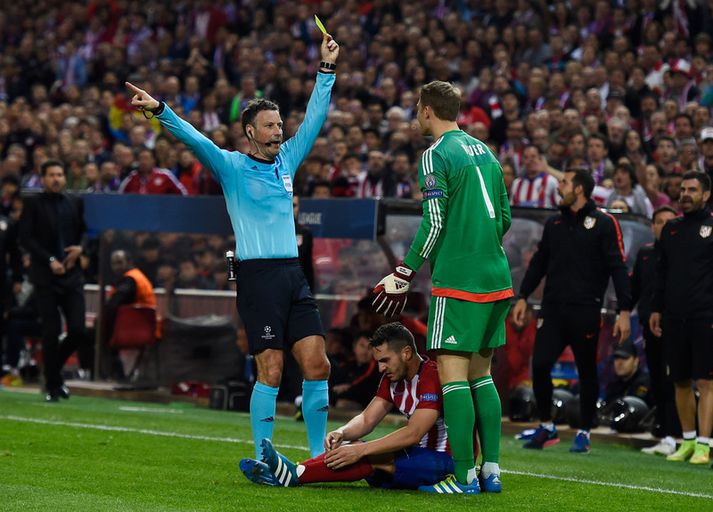Enski dómarinn Mark Clattenburg hefur átt mjög gott tímabil og hann er líka að uppskera nú í mánuði stóru leikjanna í fótboltanum. Pierluigi Collina, yfirmaður dómaramála hjá UEFA, hefur ákveðið að Mark Clattenburg dæmi úrslitaleik Meistaradeildarinnar sem fer fram á San Siro í Mílanó 28. maí næstkomandi. Madrídar-liðin Real og Atletico mætast í úrslitaleik Meistaradeildarinnar í annað skiptið á þremur árum. Það verður þó ekki eini stórleikur kappans í mánuðinum því sjö dögum fyrr mun hann dæma bikarúrslitaleik Manchester United og Crystal Palace á Wembley. Mark Clattenburg verður með þessu fyrsti dómarinn sem dæmir þessa tvo leiki á sama tímabilinu. Mark Clattenburg er 41 árs gamall og dæmdi sinn fyrsta leik í ensku úrvalsdeildinni árið 2004. Hann hefur verið alþjóðlegur dómari síðan 2007. Mark Clattenburg var aðstoðarmaður á EM 2012, dæmdi úrslitaleik karla á Ólympíuleikunum í London 2012 og er einn af átján dómurum sem munu dæma á EM í Frakklandi í sumar. Mark Clattenburg gæti því kannski fengið að dæma þriðja úrslitaleikinn fari hann alla leið á Evrópumótinu og enska landsliðið kemst ekki í úrslitaleikinn í París.Hér gengur mikið á hjá Mark Clattenburg.Vísir/Getty