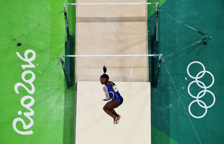 Hin nítján ára fimleikadrottning, Simone Biles, heldur áfram að safna verðlaunum á Ólympíuleikunum í Ríó, en hún vann sitt annað gull á leikunum í kvöld. Biles, sem Vísir fjallaði vel um í dag, er einungis 1,45 m á hæð, en í kvöld varð hún Ólympíumeistari í keppni í fjölþraut í fimleikum. Þetta eru hennar fyrstu Ólympíuleikar. Hún var efst eftir undanúrslitin og komst örugglega inn í úrslitin, en hún var með 62.366 stig eftir undanrásirnar. Í úrslitunum fékk hún svo 62.198 stig, en næst kom önnur bandarísk fimleikadrottning, Alexandra Raisman. Í þriðja sætinu var hin rússneska Aliya Mustafina. Eyþóra Elísabet Þórsdóttir lenti í níunda sæti í kvöld, en hún keppir fyrir Hollands hönd. Hún hefur alla tíð búið í Hollandi, en á þó íslenska foreldra. Eyþóra fékk 57,632 stig í úrslitunum, en flaug inn í úrslitin á 57,566 stigum. Hún fór áttunda inn í úrslitin. Hér að neðan má sjá nokkrar myndir af keppninni í kvöld, en það er ansi ljóst að Biles er ein sú besta ef ekki besta í heiminum í fimleikum í dag.