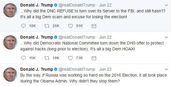 Háttsettur þingmaður Demókrataflokksins í Bandaríkjunum hefur gagnrýnt Barack Obama, fyrrverandi forseta Bandaríkjanna, fyrir að hafa ekki gripið til umfangsmikilli aðgerða þegar ljóst var að yfirvöld í Rússlandi ætluðu sér að hafa áhrif á forsetakosningarnar sem haldnar voru þar í landi í fyrra. „Ég held að ríkisstjórn Obama hefði átt að gera mun meira þegar afskipti Rússa urðu ljós, og þegar það varð ljóst að þeim var stýrt úr hæstu hæðum Kremlin,“ sagði Adam Schiff í þættinum State of the Union á CNN.Schiff er æðsti meðlimur demókrata sem tilheyrir þingnefnd fulltrúadeildarinnar um njósnamál, en hann og þingkonan Dianne Feinstein þrýstu á ríkisstjórn Obama fyrir kosningarnar. Hann segir ákvörðun Obama að grípa ekki til aðgerða fyrr en eftir kosningarnar hafa verið ranga. „Bandaríska þjóðin þurfti að vita hvað væri að gerast.“ Því gripu Schiff og Feinstein til þess ráðs að birta einhliða yfirlýsingu þar sem þingmennirnir sögðu ljóst að markmið Rússa væri að hafa áhrif á niðurstöður kosninganna og að kölluðu eftir því að afskiptum þeirra yrði hætt.Washington Post birti nýverið ítarlega grein um að Obama hefði fengið upplýsingar um afskipti Rússa í ágúst í fyrra og að Vladimir Putin, forseti Rússlands, hefði gefið skipun um slík afskipti. Markmiðið með þeim aðgerðum væri að hjálpa Donald Trump að vinna kosningarnar sem haldnar voru í nóvember. Upplýsingarnar eru sagðar hafa komið frá aðilum innan ríkisstjórnar Putin. Það var ekki fyrr en í desember sem ríkisstjórn Bandaríkjanna beitti þvingunum gegn Rússlandi og rak fjölda rússneskra njósnara og erindreka úr landi. Obama mun hafa óttast að ef hann gripi til aðgerða gegn Rússum yrði talið að hann væri sjálfur að skipta sér af kosningunum. Donald Trump hefur tíst um fregnir Washington Post um helgina og nú í dag. Tíst Trump í dag þar sem hann gagnrýnir Obama og fer fram á afsökunarbeiðni.Nú segir hann að ástæða þess að Obama hafi „ekkert gert eftir að hafa fengið upplýsingar um afskipti“ hafi verið að hann taldi að Hillary Clinton myndi vinna og því hafi hann ekki viljað „rugga bátnum“. Trump virðist gagnrýna Obama fyrir aðgerðaleysið og segir að Clinton og demókratar hafi ekki grætt á Obama hafði ekki brugðist við.Tíst Trump frá 22. júní þegar hann sagði allar fregnir um afskipti Rússa vera gabb demókrata.Trump hefur í gegnum tíðina verið margsaga um afskipti Rússa og nú síðast þann 22. júní sagði hann að þetta væri ekkert annað en gabb demókrata til að afsaka tap þeirra í kosningunum. Hann hefur áður sagt að Kína hefði mögulega gert tölvuárásir en ekki Rússar og jafnvel einhver feitur maður í sófanum sínum.Tweets by realDonaldTrump