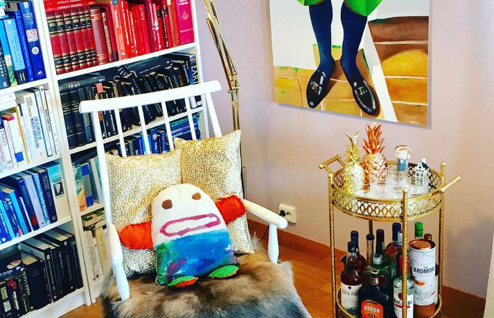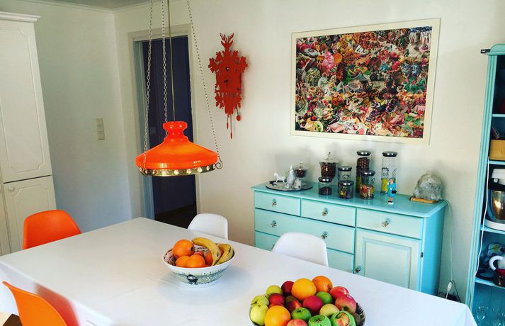 Aldís býr í litskrúðugu og skemmtilegu heimili í Noregi Guðný Hrönn skrifar 24. ágúst 2017 11:45 Innblásturinn kemur úr öllum áttum að sögn Aldísar og húsgögn og stofustáss kaupir hún víða. Listakonan og kennarinn Aldís Gunnarsdóttir býr á litríku heimili í Noregi. Þangað flutti hún fyrir sjö árum og síðan þá hefur smekkur hennar á innanhússhönnun verið að breytast smátt og smátt. „Síðan við fluttum til Noregs hef ég orðið hrifin af skandinavískum stíl og meiri litum. Ég fór frá litlausu heimili yfir í mikla litadýrð sem ágerðist eftir að ég kláraði listaskólann hér í Álasundi,“ segir Aldís sem býr ásamt manni sínum og tveimur börnum í stóru húsi sem hún lýsir sem dæmigerðu norsku timburhúsi. „Það er með A-þaki og frönskum gluggum.“ Það sem vekur athygli við heimili Aldísar er litadýrðin sem ríkir og skemmtilegir munir prýða hvern krók og kima. „Ég hef satt best að segja engan einn ákveðinn stíl. Ég blanda oftar en ekki saman nýju og gömlu, hvítu og lit og svo síðasta ár hef ég puntað svolítið með kopar, gulli og silfri og þá blanda ég því öllu saman í einn graut.“„Ég er ekkert endilega viss um að innanhússhönnuðir væru alltaf sammála uppsetningunni en ég þarf auðvitað ekkert að spá í það. Hver segir að ólíkir metallitir geti ekki átt saman? Ég neita því bara staðfastlega að það sé ekki hægt að blanda þeim saman,“ segir hún og hlær. „Þegar við fluttum inn í nýtt hús, fyrir um tveimur árum, þá fannst mér ekkert annað koma til greina en að hafa fallega liti í kringum mig. Kannski var það líka uppreisnarseggurinn í mér sem fékk útrás og fór í mótþróa við allt sem var svart, hvítt og grátt þó að mér finnist það oft mjög fallegt hjá öðrum.“ Þræðir flóamarkaði„Það er svo skemmtilega heimilislegt að horfa á Mónu greyið með strikavarir eftir bróderinguna,“ segir Aldís um myndina af Mónu.„Mín uppáhaldslitasamsetning eru bjartir litir sem oftar en ekki eru á móti hver öðrum á litaspjaldi. Mér finnst til dæmis turkísblár og appelsínugulur mjög fallegir saman. Mér finnst bara litir almennt vera skemmtilegir og hressandi,“ útskýrir Aldís sem er mikill fagurkeri. „Eitt af mínum áhugamálum er að þræða flóamarkaði í fjársjóðsleit og það eru ófáir hlutir á heimilinu þaðan. Ég hef til dæmis gert upp ruggustól, hengt upp bróderaða mynd af Mónu Lísu þar sem ég spreyjaði gullrammann bleikan og keypt mörg glös og skrautmuni sem núna prýða heimilið. Það eru ansi margir hlutir á heimilinu keyptir notaðir, hvort sem það eru húsgögn eða skrautmunir og svo er ég mjög veik fyrir búsáhaldabúðum, ég er með ákveðið blæti fyrir þeim. En ég get líka dottið í það að kaupa dýra og vandaða muni sem mér þykja fallegir. Ætli það megi ekki bara líkja mér við hrafninn sem dregst að öllu sem glitrar.“ Hús og heimili Mest lesið Tchéky Karyo látinn Lífið Stjörnurnar á hrekkjavökunni: Louvre-þjófur og vampírur Lífið Samkeppnin í New York minnti á X-Factor keppni Menning Telur Sweeney hafa verið blekkta í kjólinn Tíska og hönnun Fasteignasalar og ofurskvísur í Októberfest stemningu Lífið Ískyggilega líkur ofurfyrirsætu: „Ég er með píku“ Lífið Nýr skemmti- og spjallþáttur á Sýn Lífið Breytti um nafn eftir djúpa ástarsorg Tónlist Fréttatía vikunnar: Ríkislögreglustjóri, fellibylur og rasisti Lífið Fundin eftir sjö vikur á vergangi: „Takk hver sem þú ert“ Lífið Fleiri fréttir Tchéky Karyo látinn Stjörnurnar á hrekkjavökunni: Louvre-þjófur og vampírur Fréttatía vikunnar: Ríkislögreglustjóri, fellibylur og rasisti Láta forræðishyggju hinna fullorðnu ekki fipa sig Heillandi raðhús Evu Maríu og Trausta til sölu Nýr skemmti- og spjallþáttur á Sýn Fundin eftir sjö vikur á vergangi: „Takk hver sem þú ert“ Fresta hrekkjavöku til að tryggja öryggi lítilla skrímsla Stjörnurnar skinu skært á sögulegum sjónvarpsverðlaunum Atli Steinn fann ástina á ný „Síðasta flugtak“ Play í Gamla bíói Már Gunnars genginn út Verk Þórdísar Erlu munu prýða auglýsingaskilti borgarinnar Steingleymdi að taka niður sólgleraugun Hvenær má byrja að spila jólalög? Stílhrein og stílíseruð útsýnisíbúð við Heiðmörk Ískyggilega líkur ofurfyrirsætu: „Ég er með píku“ „Get ekki gengið óstudd og framundan er mikil endurhæfing“ Ótrúlegur bílskúr Hönnu Rúnar: „Hvar ertu?“ Lét flúra brúðkaupsdaginn á sig en gerði mistök Sviti, mjólk og hóstakast eftir að hafa manað hvor annan Yfir 170 góðgerðafélög hlutu styrk í áheitasöfnun Reykjavíkurmaraþons Sigurjón og Sóley gjörbreyttu eldhúsinu með einstakri útkomu „Alvöru“ jólasveinn gisti á Hótel Rangá Fasteignasalar og ofurskvísur í Októberfest stemningu Eitt glæsilegasta hús Reykjavíkur til sölu „Þetta er það fallegasta sem einhver hefur sagt um mig“ Hvað þýðir „six-seven“? Smáforrit til að deila heimilisverkum: „Fæ þrjú stig fyrir að þurrka af á heimilinu“ Kynslóðabilið kom í ljós þegar umræðan beindist að blautbolakeppni Sjá meira