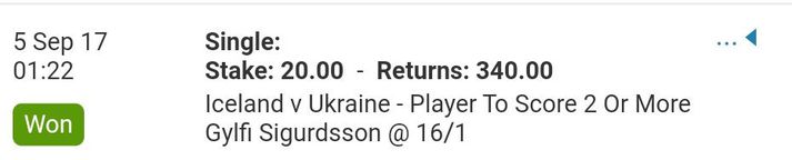 Veðjaði 20 evrum á að Gylfi myndi skora tvö eða fleiri Anton Ingi Leifsson skrifar 5. september 2017 22:30 Skjáskot af seðli Sigurjóns. vísir/skjáskot Sigurjón Jónsson, athafnamaður og Framsóknarmaður, hafði mikla trú á að Gylfi Þór Sigurðsson myndi gera það gott í leik Íslands og Úkraínu í undankeppni HM í kvöld. Gylfi gerði sér lítið fyrir og skoraði tvö mörk í leiknum, en það fyrra kom eftir sendingu frá Emil Hallfreðssyni og það síðara eftir glæsilega sókn. Sigurjón eða Siggi Sör eins og hann er oftast kallaður lét slag standa fyrir leik og hafði mikla trú á því að Gylfi myndi gera það gott í leiknum, en hann veðjaði því að Gylfi myndi skora tvö mörk eða fleiri í leiknum gegn Úkraínu á Laugardalsvelli í kvöld. Hann lagði 20 evrur undir sem jafngildir rúmum 2500 krónum (2532 krónur) og það skilaði honum til baka rúmum 43 þúsund krónum (43.050), en Gylfi skoraði bæði mörkin í 2-0 sigri. Heppinn sá! Sigurjón greindi frá þessu á Twitter síðu sinni, en tístið má sjá hér að neðan.Loyalty á Gylfa... Sör knows pic.twitter.com/QoLXcQpMFq— Sigurjón Jónsson (@siggisorensen) September 5, 2017 HM 2018 í Rússlandi Tengdar fréttir Umfjöllun: Ísland - Úkraína 2-0 | Stórkostlegur seinni hálfleikur og sigur á Úkraínumönnum Ísland kom sér í lykilstöðu í I-riðli undankeppni HM 2018 með 2-0 sigri á Úkraínu í kvöld. Gylfi Þór Sigurðsson skoraði bæði mörk Íslands í síðari hálfleik, sem var einn sá besti sem Ísland hefur sýnt síðustu árin og er af mörgu að taka. 5. september 2017 20:30 Mest lesið Bunting dró orð sín til baka með tárin í augunum: „Ég er ekki meistari fólksins“ Sport Sakaður um svindl á HM í pílukasti Sport Sjáðu geggjaðan snúning Alberts áður en hann skoraði frábært mark Fótbolti Áhorfendur ærðust eftir mögulega mark mótsins í fyrsta leik Fótbolti Óskar Hrafn um komu Arnórs Ingva: „Gífurlega dýrmætt fyrir KR“ Íslenski boltinn Klappstýrur Björgvins Karls slógu í gegn Sport Ótrúleg tíðindi á HM í pílukasti: „Mikið sjokk“ Sport Óttast að Isak hafi fótbrotnað Enski boltinn Hleður Kjartan lofi eftir frábæra frumraun með Aberdeen Fótbolti Freyr himinlifandi með íslensku strákana Fótbolti Fleiri fréttir „Ef þið væruð Antoine Semenyo, hvert mynduð þið fara?“ Freyr himinlifandi með íslensku strákana Sjáðu geggjaðan snúning Alberts áður en hann skoraði frábært mark Óskar Hrafn um komu Arnórs Ingva: „Gífurlega dýrmætt fyrir KR“ Áhorfendur ærðust eftir mögulega mark mótsins í fyrsta leik Sjáðu mörkin: Rogers sá um Manchester United Hleður Kjartan lofi eftir frábæra frumraun með Aberdeen Óttast að Isak hafi fótbrotnað Túfa gerir þriggja ára samning í Svíþjóð Arnór Ingvi orðinn leikmaður KR Albert skoraði í fyrsta sigri Fiorentina Bæjarar aftur á sigurbraut Tvenna frá Rogers tryggði Villa sigur gegn Manchester United Barcelona með fjögurra stiga forskot inn í nýtt ár Alvöru innkoma: Kjartan með stoðsendingu gegn Celtic í sínum fyrsta leik Sandra María hetjan og með þeim markahæstu í Þýskalandi Katla skoraði annan leikinn í röð Tómas Bent og félagar unnu Rangers og náðu átta stiga forskoti á toppnum Breiðablik kaupir Jónatan frá Norrköping Hildur áfram í bikarnum og Amanda enn á toppnum Fimmta sinn sem Arsenal er á toppnum um jólin: Unnu ekki titilinn í fyrstu fjögur skiptin „Viljum við að okkar verði minnst fyrir að vera skræfur?“ „Ef dómarinn hefði sinnt sínu starfi almennilega hefði Romero ekki fengið spjald“ Haaland gaf barnabarni Hareide gjöf Sjáðu mörkin úr enska: Sviptingar, sænskt þema og svakalegar tæklingar Madrídingar anda ofan í hálsmálið á Börsungum Calvert-Lewin hættir ekki að skora Gyökeres skaut Arsenal aftur á toppinn Ronaldo á nærbuxunum lætur Elon Musk efast um sjálfan sig Orri Steinn kominn með nýjan þjálfara Sjá meira