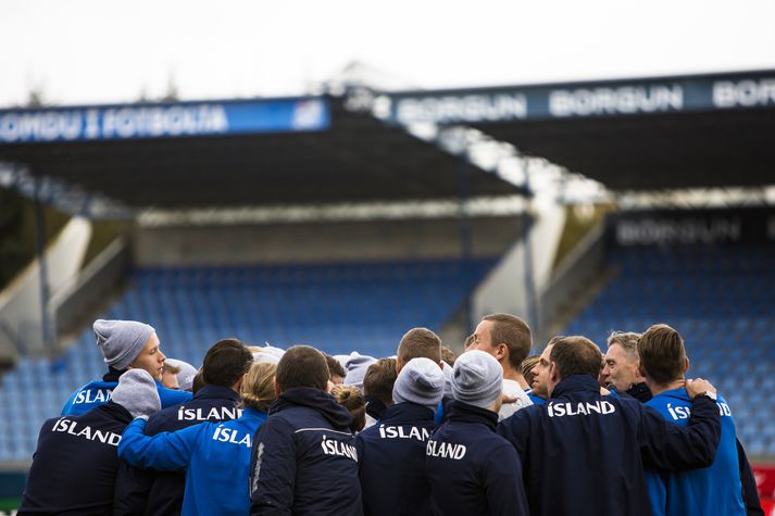 Heimir Hallgrímsson bar mikið lof á starfslið íslenska karlalandsliðsins í fótbolta á blaðamannafundi á Laugardalsvelli í morgun. „Ég vil hrósa starfsliðinu. Þessa níu daga hafa verið tvær nætur þar sem það hefur ekki fengið einn einasta klukkutíma í svefn. Það sýnir að þessi liðsheild nær miklu lengra en þessir strákar sem eru inni á vellinum,“ sagði Heimir. „Það eru allir tilbúnir að leggja sig fram til að þessi hópur spili betur og honum gangi betur. Ég vil hrósa starfsliðinu sem hefur verið frábært í þessari ferð.“ Heimir sagði svo stutta sögu sem honum finnst sýna hversu öflugt starfsliðið er. „Við fengum farangurinn okkar degi fyrir Tyrkjaleikinn. Þeir voru að þvo búningana. Það var eitt sett af æfingafatnaði og hótelgöllum og menn voru á næturnar að þvo svo það væri hægt að fara í þá daginn eftir,“ sagði Heimir. „Það eru ekkert margir hópar sem hefðu haldið einbeitingu og látið þetta ekki fara í taugarnar á sér. Starfsliðið á þvílíkt hrós skilið og ég held að við hefðum ekki getað fengið betri undirbúning.“ Blaðamannafundinn í heild sinni má sjá hér að neðan.