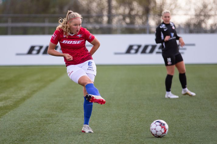 Valur er enn með tveggja stiga forystu á toppi Pepsi Max-deildar kvenna eftir 0-1 sigur á bikarmeisturum Selfoss á útivelli í kvöld. Valskonur hafa unnið alla sjö útileiki sína á tímabilinu. Hlín Eiríksdóttir skoraði eina mark leiksins um miðjan seinni hálfleik. Hún er markahæst í deildinni ásamt samherja sínum hjá Val, Elínu Mettu Jensen. Þær hafa báðar skorað 13 mörk. Þrátt fyrir að hafa spilað 120 mínútna bikarúrslitaleik á laugardaginn og vera án Hólmfríðar Magnúsdóttur var kraftur í Selfyssingum í leiknum í kvöld. Heimakonur sluppu reyndar vel undir lok fyrri hálfleiks. Fyrst varði Kelsey Wys tvisvar í sömu sókninni og svo átti Ásgerður Stefanía Baldursdóttir skot í stöng. Staðan var markalaus í hálfleik. Á 65. mínútu skoraði Hlín sigurmarkið með skoti á lofti eftir fyrirgjöf Hallberu Gísladóttur. Skömmu fyrir leikslok fékk Anna María Bergþórsdóttir dauðafæri fyrir Selfoss en skaut yfir. Það reyndist síðasta tækifæri bikarmeistaranna sem urðu að sætta sig við tap. Selfoss er í 4. sæti deildarinnar með 22 stig, tveimur stigum á eftir Þór/KA sem er í 3. sætinu. Upplýsingar um úrslit og markaskorara eru fengnar frá Fótbolta.net.