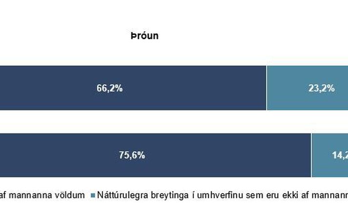 Tæplega fimmtungur svarenda í nýrri skoðanakönnun Gallup telur að hlýnun jarðar undanfarna öld sé vegna náttúrulegra breytinga, þvert á vísindalega þekkingu á orsökum loftslagsbreytingum. Hlutfall þeirra hefur hækkað um níu prósentustig frá því að sambærileg könnun var gerð fyrir rúmu ári. Meðalhiti jarðar hefur hækkað um um það bil eina gráðu frá upphafi iðnbyltingar vegna losunar manna á gróðurhúsalofttegundum, fyrst og fremst með bruna á jarðefnaeldsneyti eins og kolum, olíu og gasi. Rannsóknir sýna að menn bera ábyrgð á allri þeirri hlýnun. Umhverfiskönnun Gallup bendir engu að síður til þess að fleiri Íslendingar hafni nú þekkingu vísindamanna á orsökum hnattrænnar hlýnunar. Þannig sögðust nú 23,2% svarenda telja að hækkun á hitastigi jarðar á síðustu öld sé meira vegna náttúrulegra breytinga í umhverfinu sem eru ekki af mannanna völdum í könnun sem var gerð í janúar. Hlutfallið var 14,2% þegar sömu spurningar var spurt í desember árið 2018. Tveir af hverjum þremur svarendum töldu að hlýnun væri vegna mengunar af völdum manna. Hlutfallið dróst saman um 9,4 prósentustig frá síðustu könnun. Svipað hlutfall sagðist ekki vita það, á bilinu 10-11% í hvorri könnun. Sjá einnig: Óttast að úrtöluröddum loftslagsvísinda vaxi ásmegin Í tilkynningu frá Gallup kemur fram að viðhorfsbreytingin sé almenn en þeim sem aðhyllast náttúrulegar orsakir hlýnunar fjölgaði mest hjá fólki á aldrinum 45-55 ára, um 20%. Frekari niðurstöður könnunarinnar verða kynntar á umhverfisráðstefnu Gallup sem verður haldin í næstu viku. Merki hafa verið um að afneitun á vísindalegri þekkingu á loftslagsbreytingum hafi vaxið ásmegin á Íslandi undanfarin. Umhverfisstofnun greip þannig til þess óvanalega ráðs að senda frá sér tilkynningu til að árétta að loftslagsbreytingar séu staðreynd í haust. Vísaði stofnunin til umræðu um að hlýnun af völdum manna eigi sér annað hvort ekki stað eða að umræða vísindamanna byggðist á ýkjum.