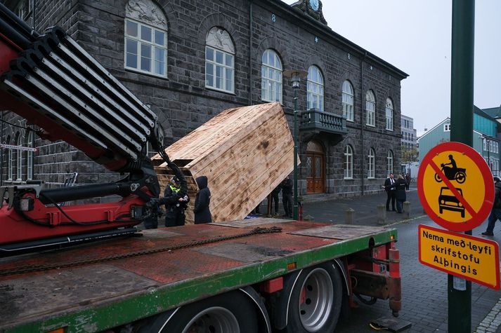 Í fréttatilkynningu frá ÖBÍ sem barst í morgun segir að með gjörningnum vilji samtökin leggja áherslu á að fátækt sé veruleiki margra á Íslandi. Þriðjungur örorkulífeyristaka búi við fátækt, sem sé engri manneskju bjóðandi og brjóti í bága við grundvallarmannréttindi. Haft er eftir Ölmu Ýr Ingólfsdóttur, formanni ÖBÍ, að fátækt sé algengari en fólk heldur. Alma Ýr Ingólfsdóttir er formaður ÖBÍ.Vísir/Anton Brink „Oft þarf ekki mikið til að fólk falli í fátæktargildruna. Það kannast alltof margir við að lenda í óvæntum útgjöldum, eins og að bíllinn bili og fólk eigi ekki nóg milli handanna til að láta gera við hann. Þá er gripið í yfirdráttinn sem þarf að greiða háa vexti af og er erfitt að greiða niður þegar afgangurinn um mánaðamótin er nú þegar enginn.“ Fjörutíu prósent sleppi jólagjöfum Ljóst sé að vandinn sé nú þegar umfangsmikill. Samkvæmt rannsókn sem Varða, rannsóknastofnun vinnumarkaðarins, vann fyrir ÖBÍ búi um 33 prósent örorkulífeyristaka við fátækt. Þá hafi 39,4 prósent neyðst til að sleppa afmælis- eða jólagjöfum og 68,5 prósent ráði ekki við óvænt 80.000 króna útgjöld nema með skuldsetningu. „Þetta þarf ekki að vera svona. Það er vel hægt að útrýma fátækt á Íslandi með markvissum aðgerðum.“ ÖBÍ leggi fram markvissar tillögur sem beint er til stjórnvalda, til að minnka hættuna á að fólk lendi í fátæktargildrunni: „Tryggja þarf öryggi í húsnæðismálum og taka á hækkandi húsnæðis og leigukostnaði, veita þarf aðgang að gjaldfrjálsri grunnþjónustu og svo þarf að sjálfsögðu að hækka lífeyri og lægstu laun svo fólk geti lifað með reisn,“ er loks haft eftir Ölmu. Gjörningnum sópað burt Ljósmyndari Vísis var við Austurvöll í morgun þegar lögregluþjónar mættu á vettvang og fyrirskipuðu að „fátæktargildran“ yrði fjarlægð. Gildrunni var vippað upp á vörubíl.Vísir/Anton Brink Það hefur nú verið gert og það á kostnað ÖBÍ.