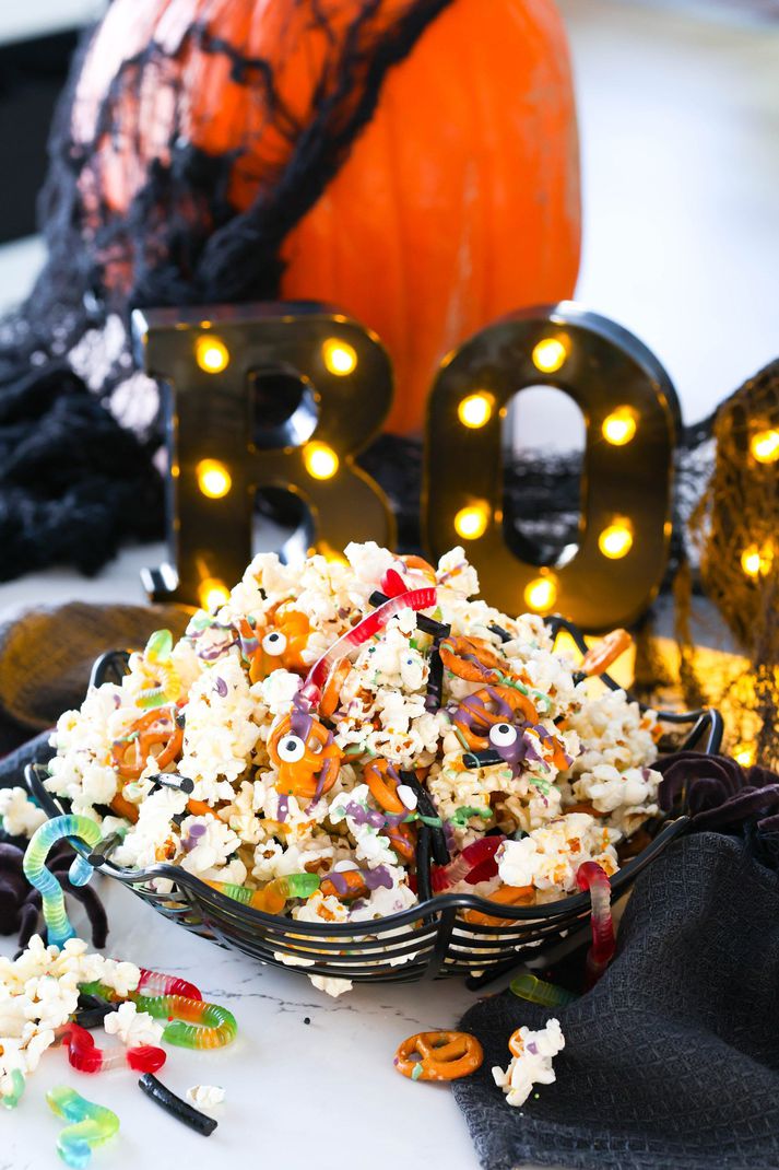 Hér að neðan má finna þrjár uppskriftir sem koma einstaklega vel út á veisluborðinu. Hrekkjavökupopp Matgæðingurinn Berglind Hreiðarsdóttir, hjá Gotterí og gersemar, útbjó flotta poppskál í Hrekkjavökubúningi sem setur skemmtilegan svip á veisluborðið. Skálin er bæði einföld í framkvæmd og fullkomin viðbót við Hrekkjavökuboðið. Hráefni: 1 poki örbylgjupopp Tvær lúkur saltkringlur Tveir pokar lakkrísreimar (skornar niður) Einn poki ormahlaup 3 msk. fjólublátt súkkulaði 3 msk. grænt súkkulaði 3 msk. appelsínugult súkkulaði Sykuraugu Kökuskraut (má sleppa) Aðferð: Poppið poppið samkvæmt leiðbeiningum og hellið á ofnskúffu íklædda bökunarpappír. Bræðið súkkulaðið (ég notaði candy melts en hér má líka bara nota dökkt og hvítt súkkulaði ef þið finnið ekki litað, það fæst t.d í Hagkaup). Stráið saltkringlum og ormahlaupi yfir poppið, dreifið úr brædda súkkulaðinu og stráið kökuskrauti og augum yfir hér og þar. Leyfið súkkulaðinu að storkna áður en þið færið yfir í aðra skál. View this post on Instagram A post shared by Gotterí og gersemar (@gotterioggersemar) Ógurlegur hrekkjavökueftirréttur Matgæðingurinn og uppskriftahöfundurinn Linda Benediktsdóttir útbjó ógurleg hrekkjavökueftirréttaglös – fullkominn eftirrétt fyrir bæði fullorðna og börn.Það er fátt skemmtilegra en að skapa eitthvað ótrúlega ljúffengt sem lítur út fyrir að vera dálítið óhugnanlegt! Þessi uppskrift er bæði einföld og skemmtileg og hentar fullkomlega á Halloween-borðið. Botn: Ljúffeng súkkulaðikaka Linda Ben kökumix 3 egg 1 dl vatn 1½ dl olía Miðlag: 1 pakki Dr. Oetker vanillubúðingur 100 g sykur 1 lítri léttmjólk Toppur 240 g Noir kex með belgísku súkkulaði (hluti mulinn, hluti heill til að gera legstein) Svartur matarlitur frá Dr. Oetker Vidal Mega Jelly Mix nammi Vidal blóðug augu nammi Aðferð skref fyrir skref: Bakið kökuna Hrærið saman kökumixið, eggin, vatnið og olíuna. Hellið deiginu í smurt form (um það bil 30×40 cm eða annað sambærilegt). Bakið við 180°C í um 25 mínútur, eða þar til kakan er bökuð í gegn. Kælið vel. Útbúið vanillubúðinginn Setjið búðingaduft, sykur og 2 dl af mjólk í skál og hrærið þar til blandan er slétt. Hitið síðan 8 dl af mjólk í potti þar til hún nær suðu. Takið pottinn af hitanum og hellið búðingablöndunni varlega út í mjólkina, hrærið stöðugt. Setjið pottinn aftur á hitann og þeytið þar til blandan þykknar og verður fallega gul á litinn. Takið af hitanum og látið kólna örlítið. Setjið saman glösin Rífið súkkulaðikökuna í bita og setjið í botninn á hverju glasi, það má hafa bitana óreglulega svo búðingurinn renni aðeins niður með hliðunum. Hellið vanillubúðingnum yfir kökubotninn. Skreytið réttinn Takið jafn mörg kex og glös, til að nota sem „legsteina“. Merjið restina af kexinu í plastpoka og stráið muldu kexinu yfir búðinginn. Skrifið RIP á bakhlið heilu kexkökurnar með svörtum matarlit og stingið einu kexi ofan í hvert glas. Skreytið síðan eftir smekk með Halloween-nammi, t.d. orma- eða drauganammi. View this post on Instagram A post shared by Linda Ben (@lindaben) Ljúffengur Hrekkjavökubakki Hildur Rut Ingimarsdóttir, matarbloggari, útbjó glæsilegan ostabakka sem hentar fullkomlega á Hrekkjavökuborðið. Með því að skera ostana og móta úr þeim beinagrindur eða aðrar skemmtilegar verur, ásamt því að bæta við hráskinku og berjum, verður bakkinn bæði girnilegur og hátíðlegur. Hráefni: 2x Camembert ost 1 Primadonna 1 Havarti með kryddi Brómber Bláber Tuc mini kex Sultur eftir smekk. T.d brómberjasultu og habanero– og appelsínusultu. Grænar ólífur Salami Hráskinka Ferskt timían Aðferð: Skerið ostana í minni bita eða mótið úr þeim beinagrind. Raðið þeim síðan fallega á bakka ásamt berjum og hráskinku, og öðru sem ykkur dettur í hug. Sjá aðferðina í myndbandinu hér að neðan. View this post on Instagram A post shared by Hildur Rut (@hildurrutingimars)