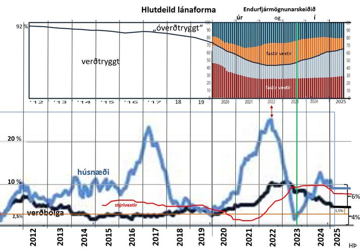 Á þeim tíma, 2020 - 22, lækkaði hlutdeild verðtryggðra lána úr 70% í 43% á tveimur árum. Við þetta hækkaði húsnæðisverð á sama tíma um 50% og verðbólga fór úr 1,7% í janúar 2020 í 10% í júlí 2022 (það dugir ekki að kenna Covid um það).