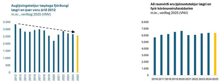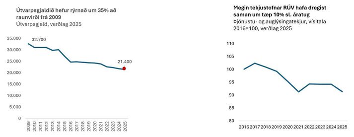 Í grein eftir forstjóra Sýnar sem birtist á Vísi 5. desember sl. undir yfirskriftinni Skekkjan á fjölmiðlamarkaði: Ríkisrisinn og raunveruleikinn er m.a. vikið að þróun þjónustu- og auglýsingatekna Ríkisútvarpsins (RÚV). Tilefni þessarar greinar er að leiðrétta rangfærslur í þeirri grein og koma á framfæri réttum upplýsingum um rekstur og fjármögnun RÚV. 1. Í greininni er ranglega farið með forsendur um framlög ríkisins til RÚV bæði fyrir árið 2016 og 2025 og skeikar þar hundruðum milljóna króna. Það leiðir til þess að ályktun um nær fjórðungs raunaukningu rekstrarframlaga úr ríkissjóði á árunum 2016-2025 er talsvert fjarri lagi. Af því leiðir enn fremur að fullyrðingin um að framlag á hvern landsmann hafi að raunvirði fylgt mannfjöldaþróun stenst ekki en Íslendingum hefur fjölgað um rétt tæp 20% á þessum tíma. 2. Í greininni kemur fram að auglýsingatekjur á öllu tímabilinu 2016-2025 séu samtals 27 milljarðar á verðlagi ársins 2025. Hér er einungis litið til samanlagðra auglýsingatekna á öllu tímabilinu en algjörlega horft fram hjá því hver þróunin hefur verið sl. 10-15 ár, sem er það sem skiptir máli fyrir fjármögnun og daglegan rekstur RÚV. Staðreyndin er sú að auglýsingatekjur RÚV, eins og annarra íslenskra fjölmiðla, hafa á föstu verðlagi farið lækkandi á því tímabili sem fjallað er um í greininni og raunar frá árinu 2012. Þessi þróun er þvert á ítrekaða umræðu um meinta aukningu auglýsingatekna. RÚV býr við sama veruleika og sömu áskoranir og aðrir fjölmiðlar hvað varðar umfang erlendra tæknirisa á íslenskum auglýsingamarkaði og styttingu auglýsinga í sjónvarpi. Auk þess hafa skorður sem settar voru á kostun og auglýsingasölu RÚV árið 2013 haft veruleg áhrif. 3. Framangreindir tveir tekjustofnar eru 95% af tekjum RÚV. Þegar litið er til þróunar þeirra á föstu verðlagi út frá þróun launa og verðlags á árunum 2016-2025 þá hafa þeir rýrnað um tæplega 10% undanfarinn áratug. Það svarar til um 900 milljóna á núverandi verðlagi. Þessi þróun á megintekjustofnum hefur blasað við stjórnendum RÚV undanfarinn áratug og blasir að óbreyttu áfram við í rekstri næstu ára. 4. Í greininni er fjallað um hlutdeild Ríkisútvarpsins á auglýsingamarkaði sem ekki er í samræmi við fyrirliggjandi gögn og greiningar frá Hagstofunni. Hlutdeild Ríkisútvarpsins á innlendum auglýsingamarkaði er rétt undir 20% og hefur það hlutfall verið svipað undanfarna áratugi. Hlutdeild Ríkisútvarpsins á heildarauglýsingamarkaði hér á landi þegar horft er bæði til innlendra og erlendra miðla er innan við 10%. Heildargreiðslur vegna birtingar auglýsinga drógust saman um 3% á árinu 2023 og auglýsingatekjur innlendra miðla drógust saman um nær 10%. Á sama tíma jukust greiðslur til erlendra miðla um 4%. 5. Í greininni er látið að því liggja að sú blandaða leið fjármögnunar hjá Ríkisútvarpinu, með þjónustutekjum og auglýsingatekjum, sem verið hefur við lýði frá upphafi hér á landi, sé óvenjuleg í erlendum samanburði. Staðreyndin er sú að nær 80% allra almannaþjónustumiðla í Evrópu eru fjármagnaðir með þessum blandaða hætti samkvæmt upplýsingum frá EBU. 6. Ríkisútvarpið á í margvíslegu samstarfi við aðra fjölmiðla á Íslandi með það að markmiði að efla og styrkja íslenskt fjölmiðlaumhverfi. Ríkisútvarpið greiðir til að mynda Sýn á hverju ári um hálfan milljarð fyrir dreifingu á efni RÚV í útvarpi og sjónvarpi um land allt. Stefán Eiríksson er útvarpsstjóri og Björn Þór Hermansson er fjármálastjóri RÚV.