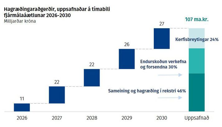 Stofnunum fækkar um tuttugu Agnar Már Másson skrifar 17. desember 2025 15:32 Kristrún Frostadóttir forsætisráðherra og Daði Már Kristófersson fjármálaráðherra veittu tillögum hagræðingarhópsins viðtöku í byrjun mars. Þær voru sextíu talsins þá en gert er ráð fyrir að um helmingur þeirra verði að veruleika. Vísir/Anton Brink Um helmingur tillagna frá hagræðingarhópi ríkisstjórnarinnar verður að veruleika, samkvæmt skýrslu vinnuhóps. Ríkisstjórnin lofar 107 milljarða hagræðingu í ríkisrekstri yfir næstu fimm árin. Flest af því sem kemur fram í tillögunum hefur þegar verið kynnt, en verði af öllum áformum mun stofnunum fækka um tuttugu. Vinnuhópur forsætisráðherra hefur skilað skýrslu um hagsýni í ríkisrekstri en þar er að finna fjölda áforma sem stjórnvöld hyggjast ráðast í eða hafa ráðist í til að draga úr ríkisútgjöldum á næstu árum. Sumt af því sem fram kemur er nýtt, til dæmis efling hraðamyndavélakerfisins til að afla aukinna tekna og auka öryggi, en annað hefur staðið yfir í þó nokkurn tíma, til dæmis fyrirhuguð sameining Háskóla Íslands við Hólaskóla. Samkvæmt núgildandi fjármálaáætlun verður hagrætt í ríkisrekstri um 107 milljarða króna á tímabili áætlunarinnar frá 2026-2030 og þar af um ellefu milljarða króna á næsta ári. Sérstök áhersla var lögð á sameiningar ríkisstofnana auk fækkunar sjóða, nefnda, stjórna og ráða á vegum ríkisins. Gangi öll áform eftir verður ríkisstofnunum fækkað um tuttugu eða um það bil, að ótalinni breytingu framhaldsskólanna sem á að fækka stofnunum um annað eins til viðbótar. Sameiningar eiga að nema 46% af allri hagræðingu en endurskoðun verkefna á að nema 30% og kerfisbreytingar 24%. Hagræðingaraðgerðir, uppsafnaðar á tímabilifjármálaáætlunar 2026-2030.Stjórnarráðið Þegar hafa verið kynnt áform um sameiningar stofnana á vegum menningar-, nýsköpunar- og háskólaráðuneytis. Þá hefur frumvarp verið lagt fram um sameiningu sýslumannsembætta og áform kynnt um kerfisbreytingu í framhaldsskólakerfinu, auk nokkurra annarra sameininga sem eru í undirbúningi eða langt komnar á vegum heilbrigðisráðuneytis, félags- og húsnæðismálaráðuneytis og atvinnuvegaráðuneytis. Stofnanir ríkisins sem heyra undir framkvæmdavaldið voru 152 í upphafi þessa árs, samkvæmt skýrslunni, þar af tæplega 70 með færri en 50 stöðugildi. Helmingur verði að veruleika Bakgrunnur skýrslunnar er sá að í byrjun kjörtímabils var efnt til samráðs við almenning og stofnanir um hagræðingu, einföldun og sameiningar. Yfir tíu þúsund ábendingar bárust. Hagræðingarhópur utanaðkomandi sérfræðinga fór yfir ábendingarnar og skilaði sextíu tillögum í mars. Vinnuhópur forsætisráðuneytisins og fjármálaráðuneytisins hefur nú farið yfir þær tillögur og skilaði hópurinn af sér skýrslu í lok nóvember. Björn Ingi var formaður starfshópsins sem forsætisráðherrann tók við.Vísir/Anton Brink „Talið er að um helmingur tillagnanna verði að veruleika á gildistíma núverandi fjármálaáætlunar, gangi áform ráðuneyta eftir,“ segir í tilkynningu Stjórnarráðsins. Alþingi hefur samt lokaorðið um það hvort hluta þessara tillagna verði hrint í framkvæmd og um endanlega útfærslu þeirra. Í skýrslunni er lauslega farið yfir hagræðingarverkefni í hverju ráðuneyti og engar upphæðir eru nefndar að undanskildum kafla um félags- og húsnæðismálaráðuneyti, sem áætlar 13 ma.kr. hagræðingu. Forsætisráðuneytið: Pappírslausir ríkisstjórnarfundir og nýtt nefndahús Í kafla forsætisráðuneytisins er fjallað um að skilvirkni verði aukin með því að koma á fót nefndarhúsi undir allar þær 35 kæru- og úrskurðarnefndir ráðuneytanna. Einnig sé unnið að samhæfingu innan Stjórnarráðsins ásamt fjármála- og efnahagsráðuneytinu. Þá sé vinna hafin við að gera ríkisstjórnarfundi pappírslausa og ríkisráðsafgreiðslur rafrænar. Loks hefur verið gerð breyting á starfsemi ríkisins á Hrafnseyri og reksturinn samofinn rekstri Þingvallaþjóðgarðs en fjárframlög til starfseminnar á Hrafnseyri voru felld niður í frumvarpi til fjárlaga 2026. Atvinnuvegaráðuneyti: Sameina Mast, Fiskistofu og Verðlagsstofu skiptaverðs Atvinnuvegaráðuneytið hefur skilgreint 18 hagræðingarverkefni, sem felast meðal annars í mati á stöðu og framtíð hafrannsókna á Íslandi. Þá verði Mast, Fiskistofa og Verðlagsstofa skiptaverðs sameinaðar. Nokkur verkefni snúi jafnframt að því að rýna stofnanir ráðuneytisins og kanna fýsileika sameininga, rýna þjónustu- og notendagjöld og gjaldskrár stofnana auk verkefna sem snúa að samkeppnis- og neytendamálum. Dómsmálaráðuneytið: Afnám jafnlaunavottunar og sameining sýslumannaembætta Undir dómsmálaráðuneytinu er talað um fyrirhugaða sameiningu sýslumannsembætta, afnám skyldu jafnlaunavottunar, lagabreytingar í útlendingamálum (svo sem afturköllun verndar, afnám 18 mánaða reglunnar, hækkun dvalarleyfagjalda og brottfararstöð) samræmd innkaup og einföldun bótaskerðinga í sakamálum. Auk þess verði prentun þingskjala hætt. Þorbjörg Sigríður Gunnlaugsdóttir dómsmálaráðherra.vísir/ívar Félags- og húsnæðismálaráðuneytið vill spara 13 milljarða Félags- og húsnæðismálaráðuneytið vinnur að umfangsmiklum verkefnum í 11 liðum sem ætlað er að leiða til rúmlega 13 ma.kr. hagræðingar á tímabili fjármálaáætlunar 2026–2030. Í þeim eru meðal annars fólgnar breytingar á atvinnuleysistryggingum (skilyrði/lengd), stytting málsmeðferðartíma í verndarmálum, nýtt örorku- og endurhæfingarkerfi, endurgreiðslur til sveitarfélaga, sameining HMS og Skipulagsstofnunar, niðurfelling launa fyrir stjórnarsetu og niðurlagning stjór