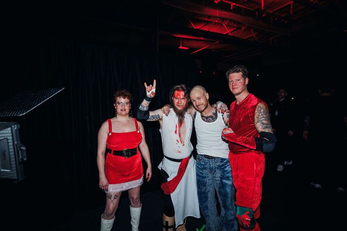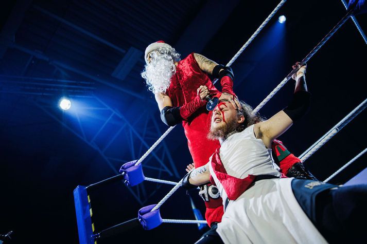 Blóðugur Kristur og brjáluð stemming í Breiðholtinu Magnús Jochum Pálsson skrifar 22. desember 2025 16:23 Finni á Prikinu og Jesú létu sig ekki vanta í Breiðholtið. Róbert Arnar Stemmingin var gríðarleg í ÍR-heimilinu í Breiðholti á laugardag þegar Emmsjé Gauti hélt Jülevenner með góðum gestum. Ragga Gísla, Finni á Prikinu Emmsjé Gauti umbreyttti ÍR-heimilinu annað árið í röð til að halda jólatónleikana Jülevenner fyrir fullu húsi. Rapparinn steig þar á stokk ásamt fjölmörgum góðum gestum, þar á meðal rapparanum Birni, Bríett, Röggu Gísla og þó nokkrum öðrum leynigestum. Margt var um manninn, veigarnar flæddu og hasarinn linnulaus. Gauti dró þá meðal annars fram bæði Finna og Geoff á Prikinu og bauð gestum svo upp á blóðuga fjölbragðaglímu milli jólasveinsins og Jesú Krists. Af myndum og stemmingunni að dæma skemmtu sér flestir en það á þó ekki við um Jónas Sen, gagnrýnanda Vísis, sem gaf tónleikum Gauta á föstudag eina stjörnu í dómi sínum í morgun og lýsti þeim sem helvíti á jörðu. Viðburðurinn hefði sannað endanlega að kapítalisminn gæti selt fólki hvað sem er, svo lengi sem það væri pakkað inn í nógu mikið glimmer og kaldhæðni. „Ef markmiðið var því að sjúga hverja einustu örðu af sál, heilagleika og menningu úr jólahátíðinni, þá tókst Gauta það ekki bara; hann fullkomnaði verkið,“ skrifaði Jónas um tónleikana. Gauti, sem bæði kann á leikinn og hefur húmor sjálfum sér, tók gagnrýninni fagnandi í samtali við mbl.is fyrr í dag. „Ég hef ekki verið jafn glaður yfir neinum dóm ever, án gríns,“ sagði hann þar. Gauti hefur húmor fyrir dómnum. „Það er eins og ég hafi skrifað þessa grein, mér finnst þessi dómur amazing. Ég opnaði hann og ég var bara stoltur af honum, ég er ekki einu sinni að grínast,“ sagði hann í sama viðtali og hefur meira að segja nýtt dóminn til að auglýsa tónleikana á næsta ári. Þannig stendur á forsöluplakatinu fyrir tónleikana skrifað stórum stöfum: „Helvíti á jörðu.“ Ljósmyndarinn Róbert Arnar mætti á tónleikana á laugardaginn og fangaði þar stemminguna sem virkaði ansi góð. Gauti góður.Róbert Arnar Bríet alltaf öflug.Róbert Arnar Jóna Margrét naut sín fremst.Róbert Arnar Bríet brilleraði.Róbert Arnar Króli tók lagið með Gauta.Róbert Arnar Ljósadýrð og gleði.Róbert Arnar Stemmingin var góð.Róbert Arnar Villi Neto ferskur á kantinum.Róbert Arnar Glæsilegt par.Róbert Arnar Þessi gamli góði skemmti fólkinu.Róbert Arnar Fjórar skvísulegar pæjur.Róbert Arnar Guðjón Smári á FM alltaf kátur.Róbert Arnar Birnir og Steindi með aldursforsetanum.Róbert Arnar Finni á Prikinu.Róbert Arnar Gauti og Erpur rifu í mækinn.Róbert Arnar Jóli tók Jesú í snúning.Róbert Arnar Jólasveinninn misþyrmdi Jesú Kristi.Róbert Arnar Gauti með glímuköppunum. Geggjaðar gellur.Róbert Arnar Steindi og góð vinkona.Róbert Arnar Allt gengið sem kom að tónleikunum.Róbert Arnar Tónleikar á Íslandi Tónlist Jól Mest lesið Helvíti á jörðu: Emmsjé Gauti minnti á líkamsræktarþjálfara í maníu Gagnrýni Hefur misst vini og kunningja vegna skoðana sinna Lífið Veikindi eyðilögðu líka stóru stund Manúelu Lífið Chris Rea hefur ekið heim um jólin í síðasta skipti Lífið „Ég hugsa til þín á hverjum einasta degi“ Lífið Stjörnulífið: Óskar tíkunum gleðilegra jóla Lífið Leitin á Svínafellsjökli sem hefur enn ekki skilað árangri Lífið Heitt í hamsi hjá gestum á „helvíti á jörðu“ í Breiðholti Lífið Saga jarðaði alla við borðið Lífið Fyrsta stiklan úr Íslandsstórvirki Nolan mætt á netið Bíó og sjónvarp Fleiri fréttir Heitt í hamsi hjá gestum á „helvíti á jörðu“ í Breiðholti Chris Rea hefur ekið heim um jólin í síðasta skipti Saga jarðaði alla við borðið Vísa ásökunum Skinner um kosningasvindl á bug Kimmel ávarpar bresku þjóðina: Frábært ár fyrir fasisma „Ég hugsa til þín á hverjum einasta degi“ Stjörnulífið: Óskar tíkunum gleðilegra jóla Veikindi eyðilögðu líka stóru stund Manúelu Hefur misst vini og kunningja vegna skoðana sinna Leitin á Svínafellsjökli sem hefur enn ekki skilað árangri Krakkatía vikunnar: Ísskápastríð, Eivör og Grafarvogur „Við byrjuðum að hlusta á jólalög í júlí“ Frægir fundu ástina 2025 Íslenska stelpan sem gerðist mormóni Fréttatía vikunnar: Rob Reiner, Dóra Björt og fullir unglingar 500 Esjuferðir á árinu: „Sumir hrista bara hausinn og lygna augunum“ Útgefandi Walliams lætur hann róa Fáklæddir barþjónar þegar Regnboginn opnaði í Bíó Paradís Þriðja stigs krabbameinið það besta sem kom fyrir hann Dúnninn bakaður í fjóra sólarhringa til að drepa allt í honum Heilsu krónprinsessunnar hrakar gríðarlega Pete orðinn pabbi Nýkominn úr meðferð og „sjaldan verið betur nýsleginn túskildingur“ Laufey á lista Obama „Ég heyrði þá kalla á mig en gat engu svarað“ Opnar sig í fyrsta sinn: Kyssti yfirmanninn í fyrsta sinn þetta kvöld Sex hundruð ára kastali Björns í Frakklandi svo gott sem klár Fyrirsát að Valgerði, Stund Pírata og meint alzheimer Þráins Bertelssonar „Það jafnar sig enginn eftir svona og við munum aldrei gera það“ Ungir sjálfstæðismenn gefa út vandræðalegt fjölskyldudagatal Sjá meira