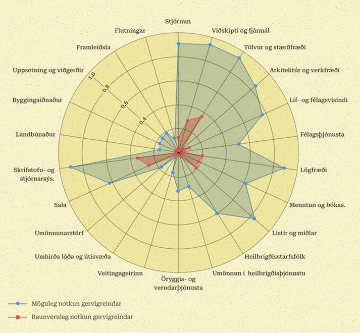 Umræða um gervigreind og vinnumarkað ber þess stundum merki að okkur hætti til að ofmeta möguleg áhrif gervigreindar á störf til skamms tíma. Það sem ég óttast meira er að við vanmetum þau til langs tíma. Geta spunagreindar hefur margfaldast á örskömmum tíma. Munu þessar framfarir framkalla fjöldaatvinnuleysi og tilheyrandi samfélagslegt ójafnvægi? Sumir telja að sú sviðsmynd sé alls ekki ómöguleg þó hún teljist ekki endilega líkleg. Það sem vegur á móti eru til dæmis þau rök að fólk, fyrirtæki og samfélög eru jafnan lengi að tileinka sér nýja tækni, að þær stórstíga framfarir sem sést hafa í notkun gervigreindar í hugbúnaðar- og þjónustustörfum verði seint yfirfærðar á aðra geira, að lög og reglur muni hægja á innleiðingu gervigreindar og að fólk muni sjálfvirknivæða ákveðin verkefni en skapa sér ný verkefni eða störf í staðinn. Sjálf hallast ég á þá sveifina að umbreytingar verði líklega hægfara frekar en hitt en viðurkenni þó að á þeim tíu árum sem ég hef fylgst með og unnið greiningar á áhrifum tækni á vinnumarkað þá hefur mér á síðustu mánuðum, í fyrsta skipti, þótt rétt að veita þeirri sviðsmynd raunverulega athygli að til hópuppsagna eða mikils samdráttar í ráðningum gæti komið í ákveðnum atvinnugreinum eða starfsstéttum. Vísbendingar um slíkt hafa komið fram síðustu daga og vikur vestanhafs, meðal annars með fréttum af uppsögnum í þúsundatali á meðal starfsmanna tæknirisanna Meta og Microsoft. Það er rétt að taka fréttum sem þessum alvarlega en hafa þó tvennt í huga; annars vegar að erlendir tæknirisar eru líklega ekki fyrirtæki sem eiga sér raunverulegar hliðstæður á íslenskum vinnumarkaði og hins vegar að stundum er erfitt að greina á milli þess hvenær notkun gervigreindar er hin raunverulega skýring uppsagna og hvenær hún er „skjól“ til réttlætingar á rekstrarlegum aðgerðum. Héðan af Íslandi er vert að nefna sem dæmi fréttir gærdagsins um væntanlega fækkun starfsfólks hjá Íslandsbanka sem sögðu stafræna þróun og aukna nýtingu gervigreindar eina af ástæðum breytinganna. Við getum undirbúið okkur Við höfum allt sem til þarf til að greina ólíkar sviðsmyndir, velja þær hagtölur eða tölulegu vísa sem við þurfum að fylgjast með til að meta hvert stefnir og skilgreina aðgerðir til að styðja við þá sem þurfa á því að halda, ef til þess kemur. Stefnuvinnan er mikilvæg og eftirfylgni með raunverulegum aðgerðum enn mikilvægari. Árið 2019 tók ég ásamt góðum hópi fólks þátt í ritun skýrslu um Ísland í fjórðu iðnbyltingunni. Þar birtum við vinnumarkaðsgreiningu og sögðum meðal annars eftirfarandi; Breytileg, huglæg verkefni sem krefjast dóm- og tilfinningagreindar, getu til að leysa vandamál, innsæis og sköpunargáfu, sem og líkamlegri verkefni sem krefjast mikillar aðlögunarhæfni eða samskipta við annað fólk, hafa enn ekki verið tæknivædd. Þetta telja sérfræðingar líklegt að verði áfram raunin, í það minnsta til skemmri tíma litið. Sömu sérfræðingar benda þó á að með gríðargögnum, gervigreind og aukinni reiknigetu, ásamt framförum í grunnrannsóknum vélræns náms, verði sjálfvirknivæðing sífellt líklegri fyrir flóknari og breytilegri verkefni. Sem dæmi má nefna framfarir sem þegar hafa orðið á getu tölva til að greina sjúkdóma, skrifa lagatexta og keyra bíla í almennri umferð. Áframhaldandi þróun í sömu átt getur leitt til þess að sjálfvirknivæðing nær smám saman einnig til starfa sem krefjast flóknari færni og meiri menntunar. Þessi raunveruleiki er einmitt sá sem við stöndum frammi fyrir í dag. Í nýrri vinnumarkaðsgreiningu sem við hjá Almannarómi birtum við útgáfu ritsins Staða Íslands í gervigreindí gær má meðal annars sjá að áhrif gervigreindar á störf virðast töluvert meiri fyrir háskólamenntaða en aðra. Þannig eru í dag aðeins rúmlega 20% háskólamenntaðra í störfum þar sem notkun gervigreindar er lítil (sjá myndræna framsetningu og nánar um forsendur hér) og tækifæri til frekari notkunar gervigreindar í minna lagi. Á móti eru rúmlega 50% þeirra sem eru ekki með háskólagráðu í störfum í sama flokki; þeim sem gera má ráð fyrir að gervigreind hafi minnst áhrif á.[ÓP1] Eðli áhrifa gervigreindar á háskólamenntaða og aðra kann þó að vera ólíkt. Þau áhrif birtast heldur í störfum þar sem gervigreind mun seint sinna öllum verkefnum sem tilheyra starfinu en frekar í störfum þar sem gervigreind getur leyst stóran hluta verkefna og þar með breytt hlutverkinu mikið. Þegar við hugsum um viðbragð við slíkri þróun ætti því áherslan að stórum hluta að vera á endurmenntun, fræðslu, ábyrgð vinnuveitenda gagnvart starfsfólki og tækifæri til nýrrar verðmætasköpunar. Svarið er líklega ekki að beina fólki frá háskólamenntun en verðug spurning er hvort og hvernig eðli hennar þarf að breytast. Með þessum hætti er tækifæri núna til að skoða þessar ólíku sviðsmyndir og hópa sem verða mögulega fyrir áhrifum og móta aðgerðir enda mun sama snið ekki henta öllum. Sérfræðistörf líkleg til að breytast mikið Í Staða gervigreindar á Íslandi 2026 spegluðum við með aðstoð Hagstofunnar raunverulegum notkunartölum frá gervigreindarfyrirtækinu Anthropic á íslenskan vinnumarkað og skoðuðum þær niðurstöður samhliða mati á því hversu stóran hluta ákveðinna starfa væri fræðilega séð hægt að sjálfvirknivæða. Hér er rétt að gera þann fyrirvara að greiningar og notkunartölur frá Bandaríkjunum eiga aldrei að fullu við íslenskan vinnumarkað og að spár sem þessar eru ekki nema það – spár – og segja ekki með vissu fyrir um mögulegt atvinnuleysi, líklega 