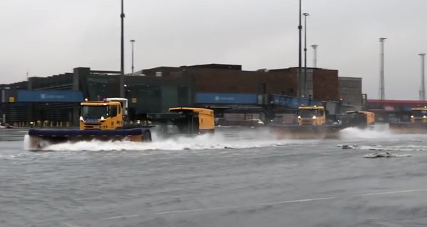 Fjöldi bíla situr fastur í umferðarteppu á þjóðveginum undir Eyjafjöllum. Hávaðarok og skafrenningur er á svæðinu.